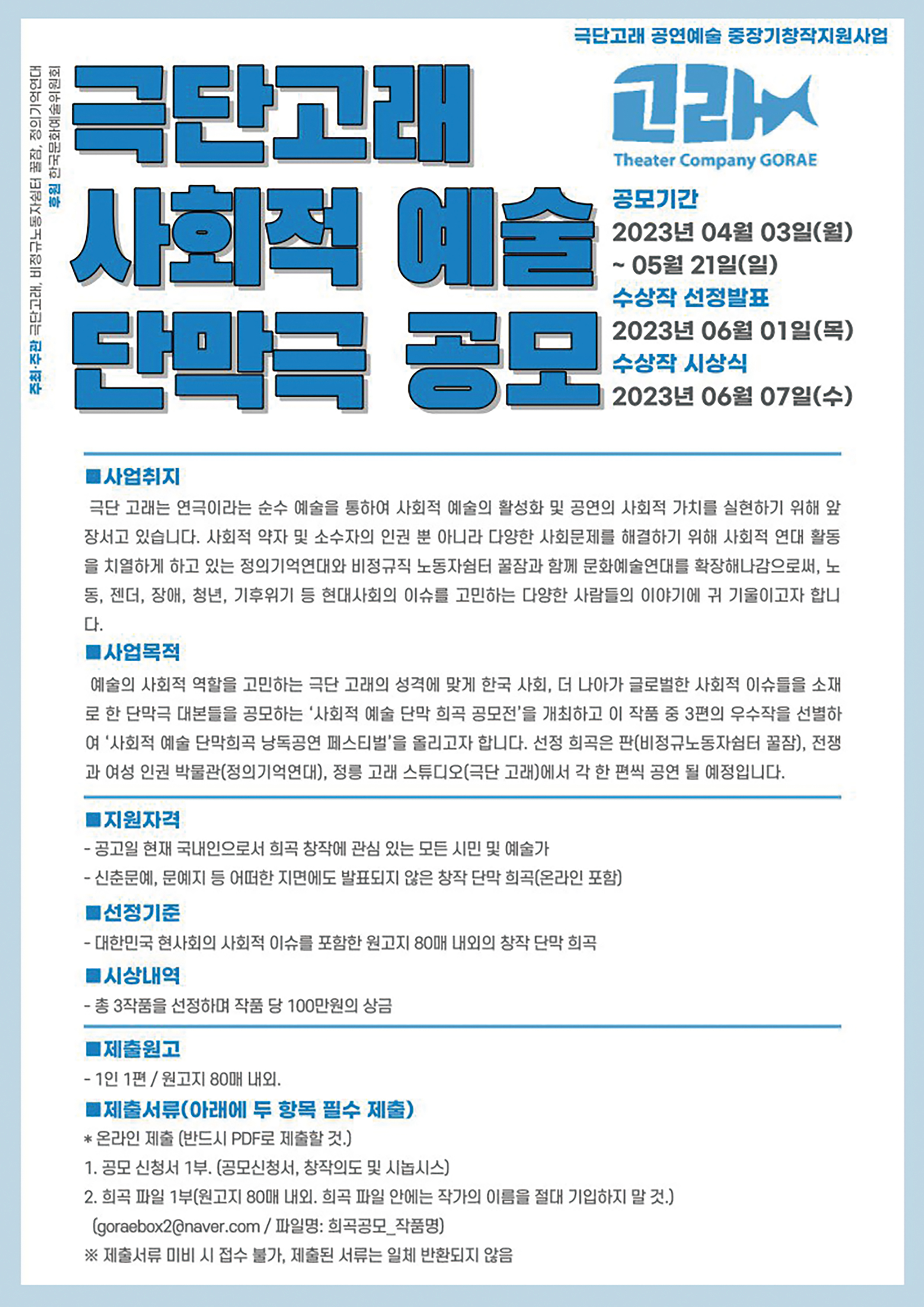 (goraebox2@naver.com / 파일명: 희곡공모_작품명)