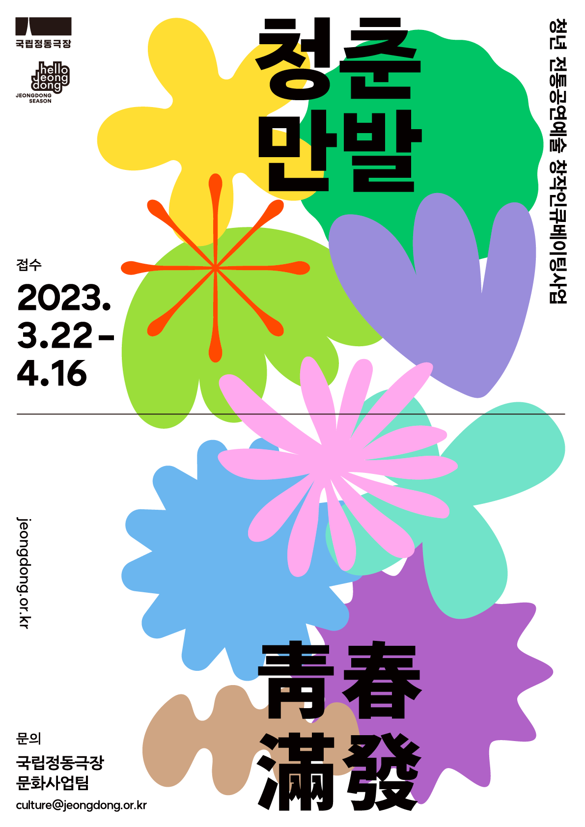 2023 '청춘만발'의 참가 접수는 4월 16일까지 진행된다. 국립정동극장 홈페이지(www.jeongdong.or.kr)에서 공모신청서를 다운받아 작성 후 이메일 접수하면 된다. (문의 국립정동극장 문화사업팀 02-751-1941)
