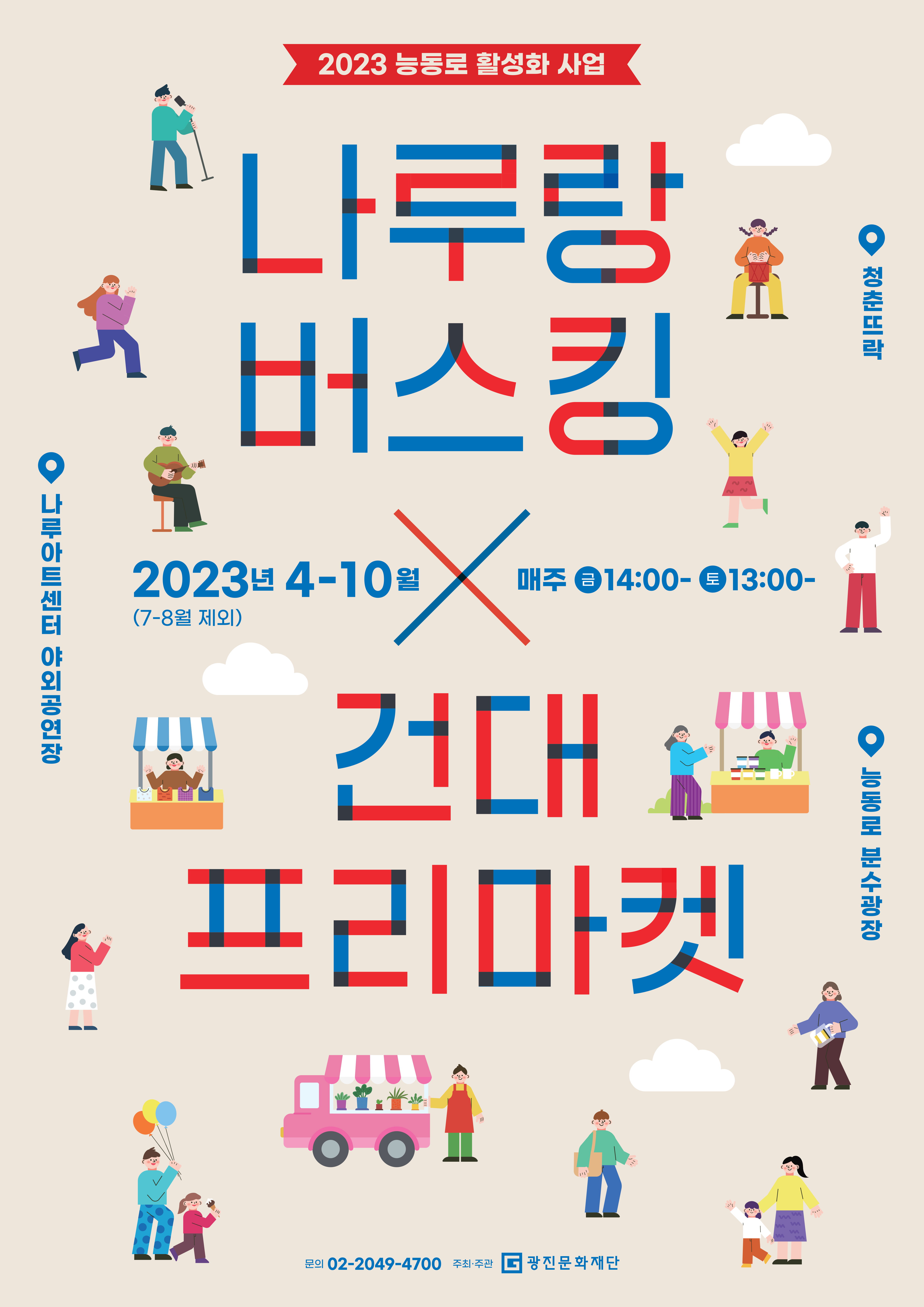 올해로 3회째를 맞은 '나루랑 버스킹'은 어린이대공원부터 뚝섬한강공원에 이르는 능동로 일대를 문화와 예술이 숨 쉬는 거리로 탈바꿈하기 위해 마련되었으며, 2023년에는 지역 프리마켓 활동 그룹 ‘건대프리마켓’과 함께한다.