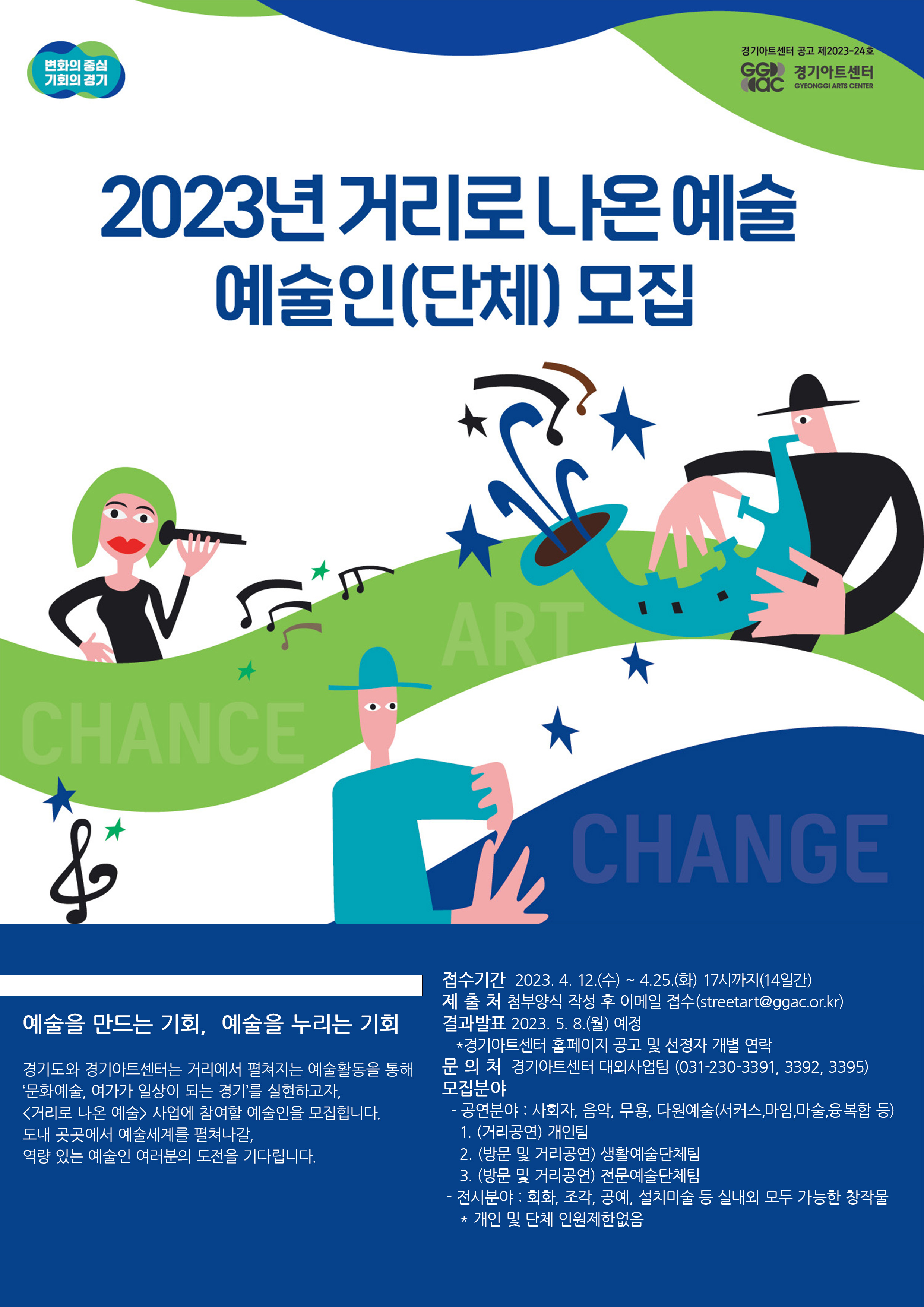[플레이뉴스 문성식기자] 경기아트센터(사장 서춘기)는 ‘2023 거리로 나온 예술’ 사업에 참여하여 도내 곳곳에서 거리예술, 문화소외시설 방문, 전시 등의 활동을 펼칠 약 1,400 팀(공연 횟수 2,000여회)의 예술인 및 예술단체를 4월 12일 (수) 부터 25일 (화) 까지 모집한다.