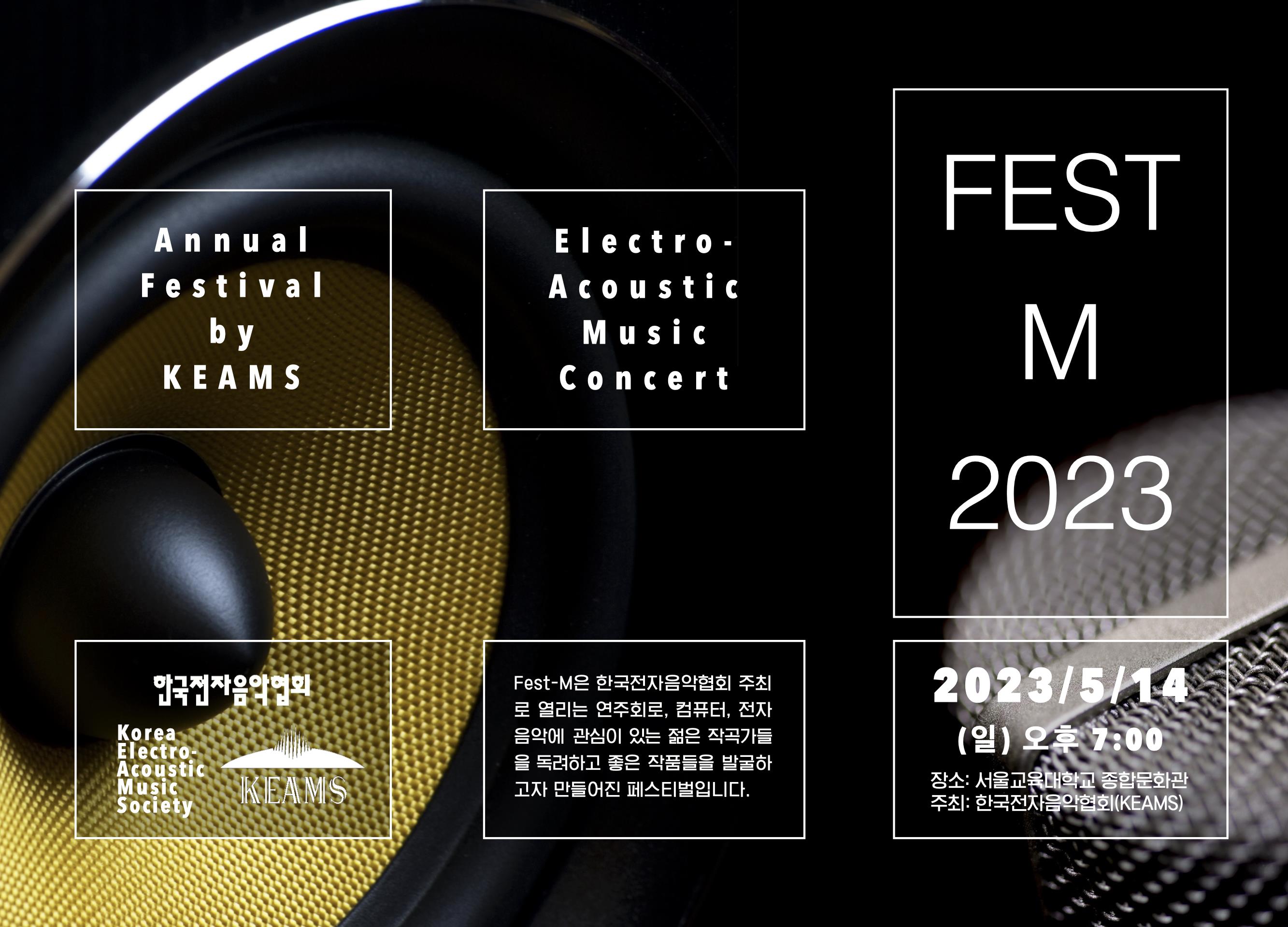 한국전자음악협회(회장 이병무)가 주최하는 Fest-M은 컴퓨터, 전자음악에 관심 있는 젊은 작곡가와 작품을 독려하고 발굴하는 축제다. 올해도 열띤 공모와 심의를 거쳐 테이프음악, 일렉트로-어쿠스틱, 오디오-비주얼 등 10개의 작품이 Fest-M에서 선보인다.