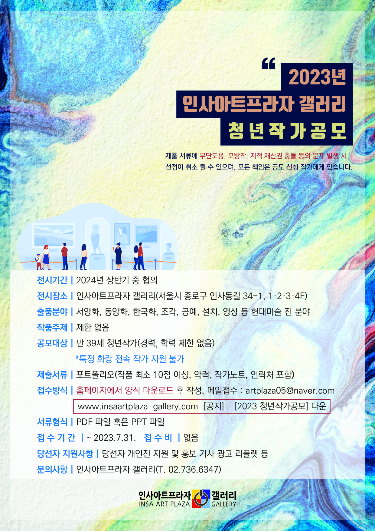 접수 방식은 인사아트프라자갤러리 홈페이지(www.insaartplaza-gallery.com) 공지에 있는 [2023 청년작가공모]양식을 다운받아 작성 후 메일(artplaza05@naver.com)로 접수 하면 된다. 문의는 인사아트프라자 갤러리 02-736-6347이다.