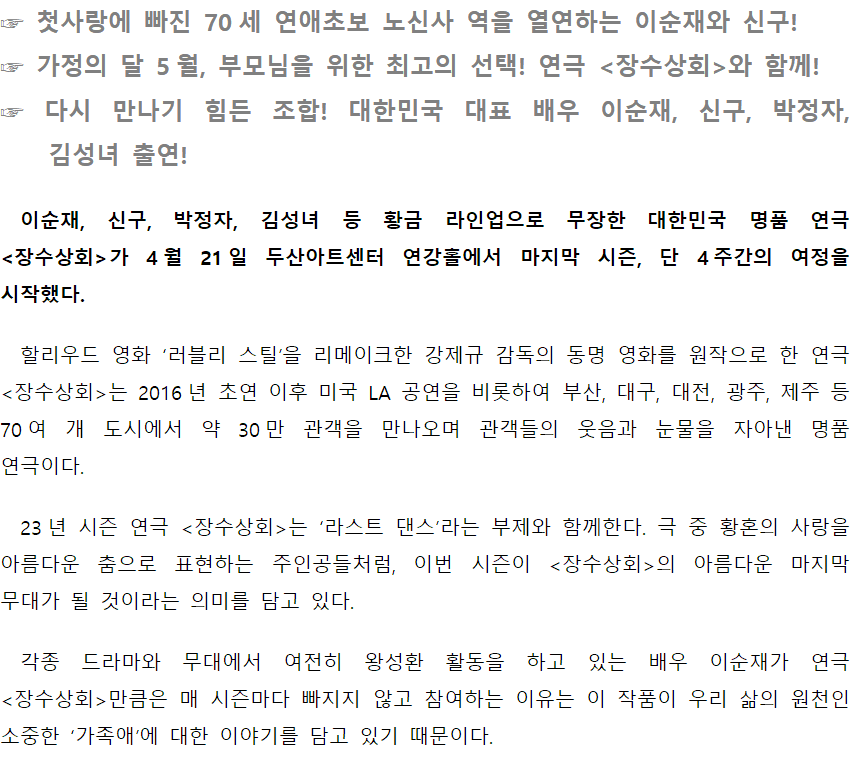 [플레이뉴스 문성식기자] 할리우드 영화 ‘러블리 스틸’을 리메이크한 강제규 감독의 동명 영화를 원작으로 한 연극 <장수상회>는 2016년 초연 이후 미국 LA 공연을 비롯하여 부산, 대구, 대전, 광주, 제주 등 70여 개 도시에서 약 30만 관객을 만나오며 관객들의 웃음과 눈물을 자아낸 명품 연극이다.