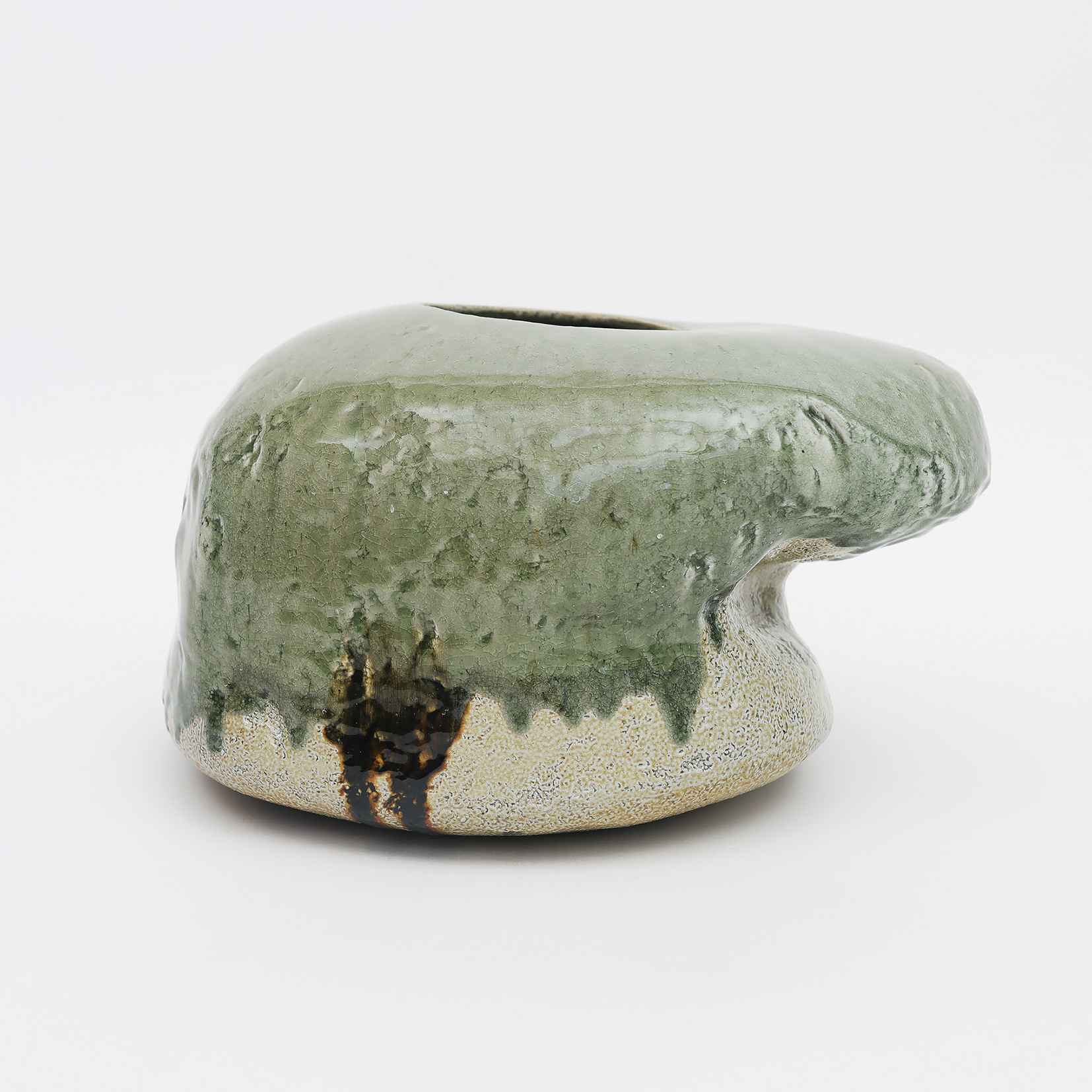 도자 표면에 유약을 두껍게 바른 채 가마에 넣어 흘러내린 유약이 일부는 채색되고 일부는 원재료가 고스란히 드러나도록 내버려 둔 방식으로 작가만의 색채 감각과 투박한 흙의 매력을 동시에 감상할 수 있다.