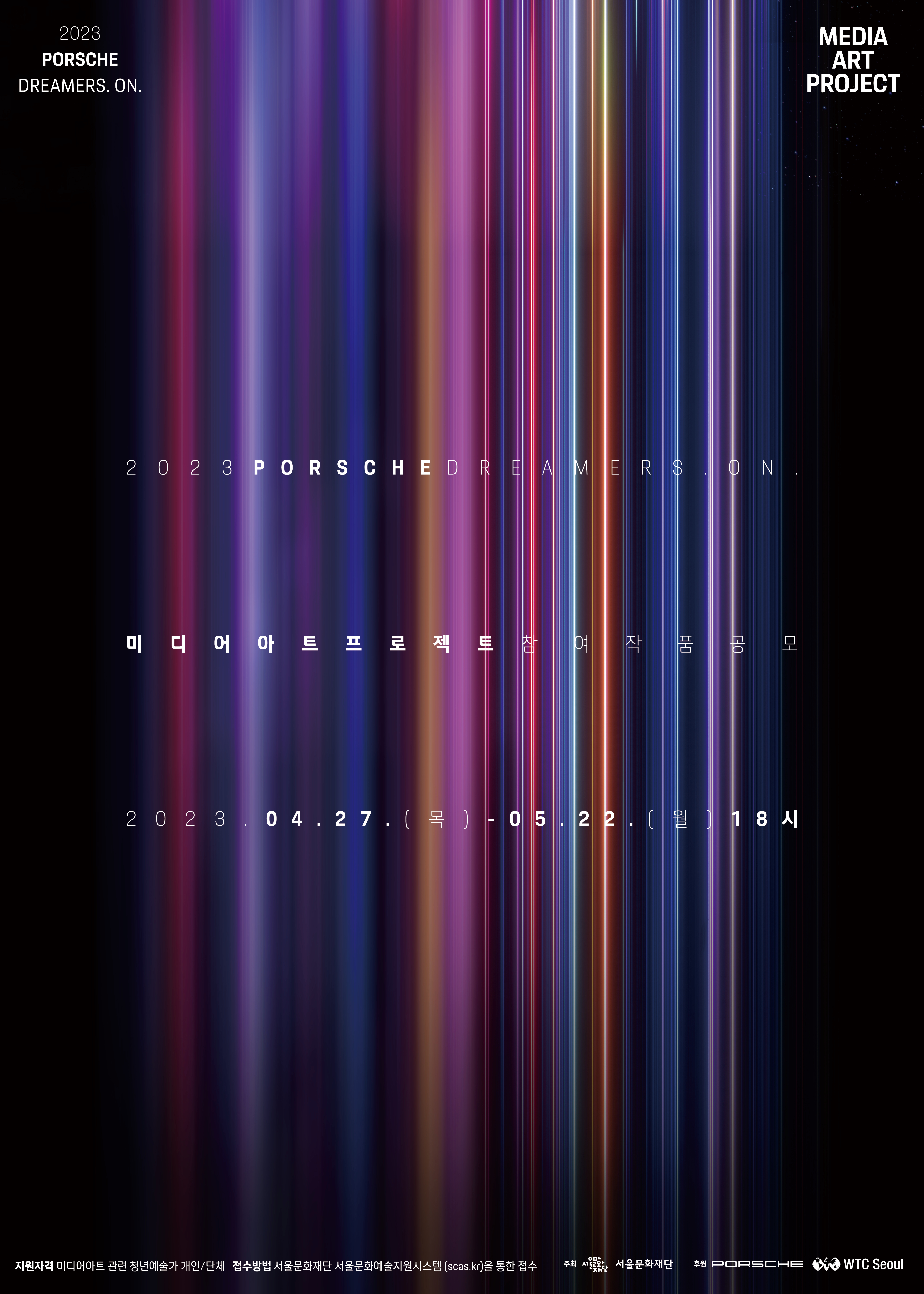 [플레이뉴스 문성식기자] 서울문화재단(대표이사 이창기)은 포르쉐코리아(대표이사 홀가 게어만)와 함께 예술가에 영감을 주고 그들의 꿈을 지원하기 위한 캠페인인 '2023년 포르쉐 드리머스 온 미디어아트 프로젝트'에 참여할 청년예술가를 오는 5월 22일(월)까지 모집한다.