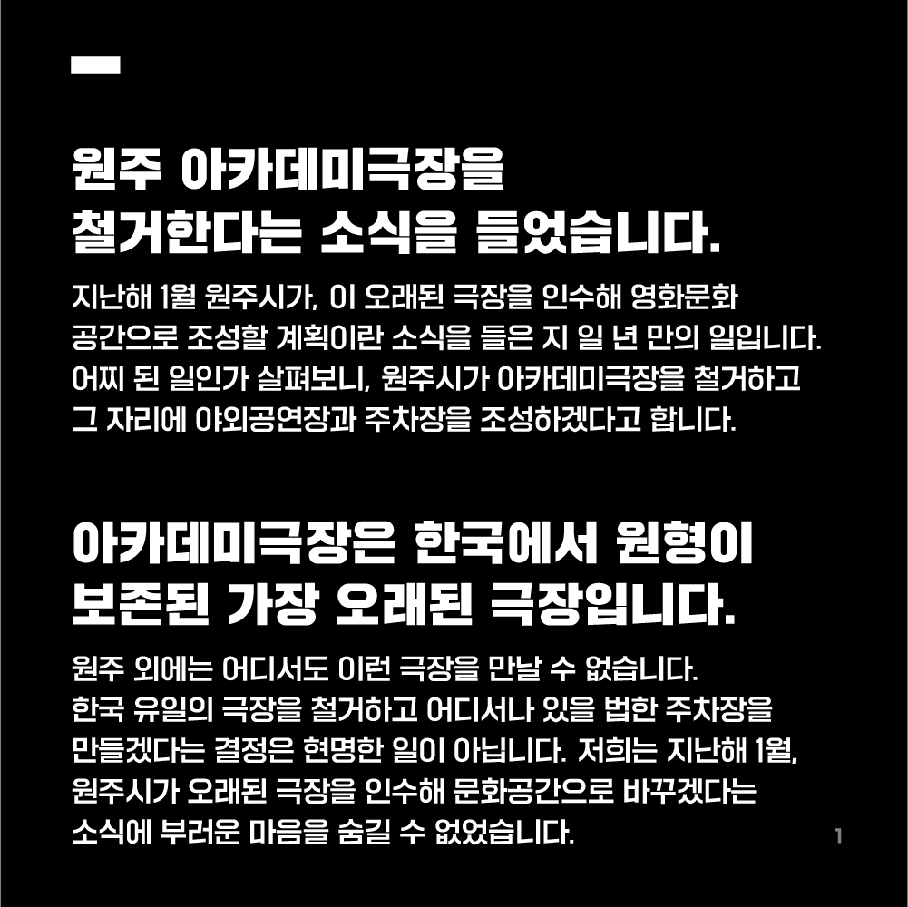 우리는 원주시가 원주 아카데미극장의 철거 결정을 철회해 주시기를 간곡히 부탁드립니다.