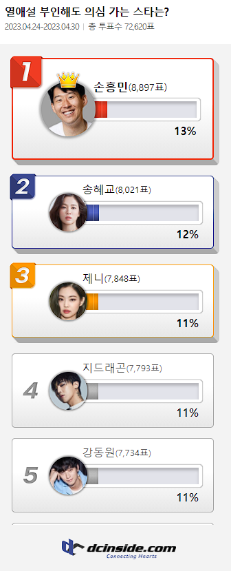 커뮤니티 포털사이트 디시인사이드(대표 김유식)가 `열애설 부인해도 의심 가는 스타는?`으로 투표를 한 결과 손흥민이 1위에 올랐다. 이 투표는 지난 24일부터 30일까지 총 7일간 진행했다.