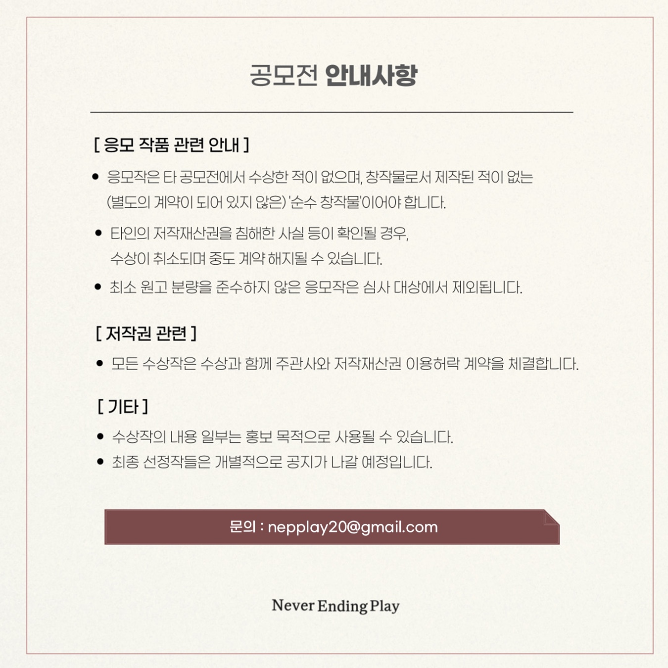 이번 공모전은 나이, 경력, 장르, 주제 어떤 것에도 제한이 없는 자유 형식을 추구했다. 특히 심사기준이 ‘네버엔딩플레이 소속 창작진들의 가슴을 두근거리게 하고 매혹하기만 하면 된다’는 흥미로운 콘셉트를 선보였다.