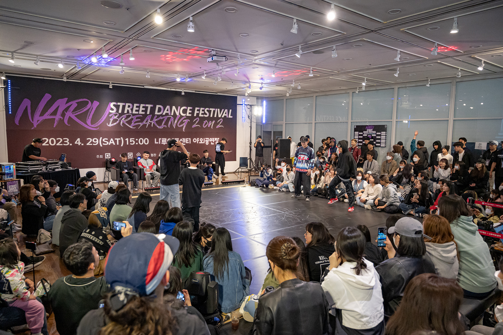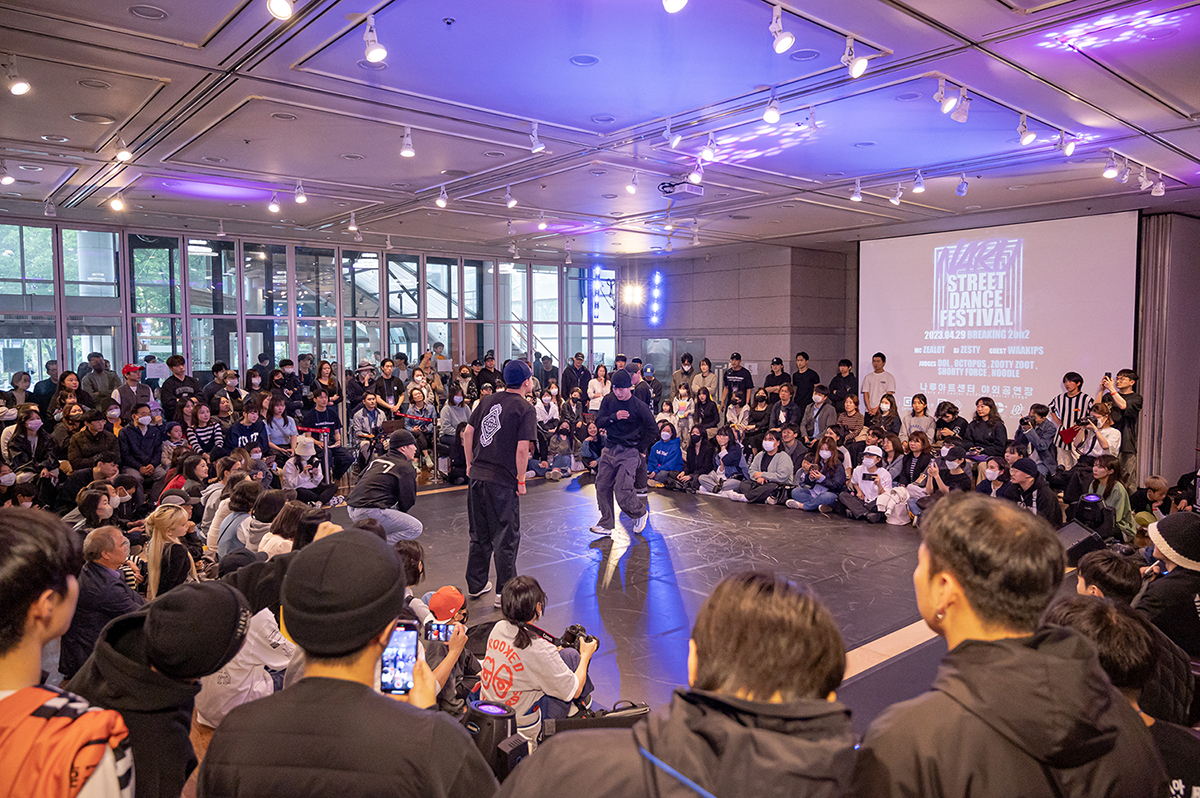 ‘2023 나루 스트릿 댄스 페스티벌’의 시작을 알린 이번 행사는 2024년 파리 올림픽 정식 종목으로 채택된 브레이킹 장르 배틀로 우천으로 인해 나루아트센터 야외공연장에서 전시실로 장소가 변경되어 진행됐다.