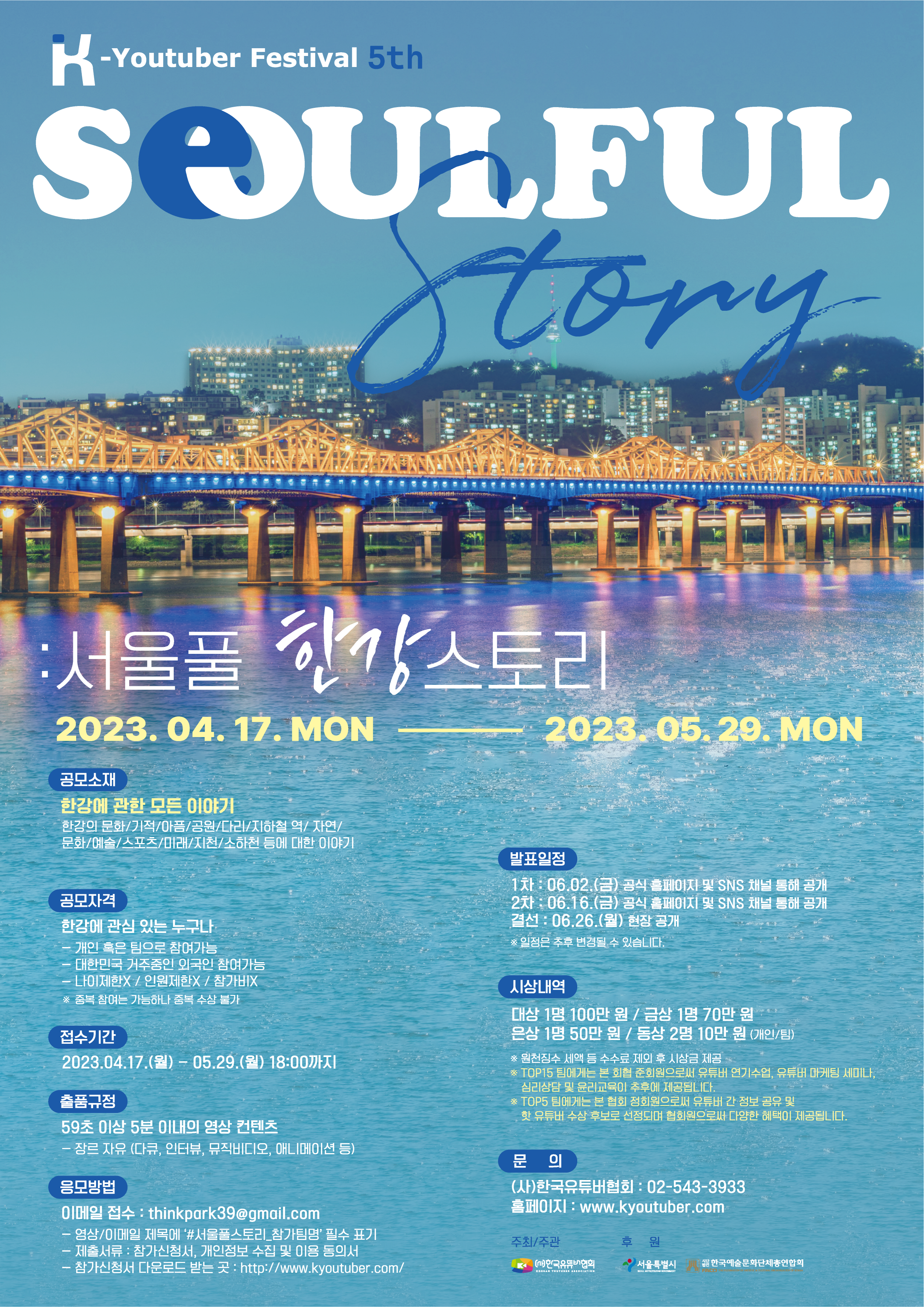 한강을 주제로 서울특별시와 (사)한국예술문화단체총연합회의 후원으로 개최하는 이번 공모전은 나이 제한, 인원 제한, 참가비가 없다. 수상자에게는 향후 지속적인 활동을 격려하기 위해 (사)한국유튜버협회에서 대상 100만원, 금상 70만원, 은상 50만원, 동상 10만원의 상금을 수여한다.
