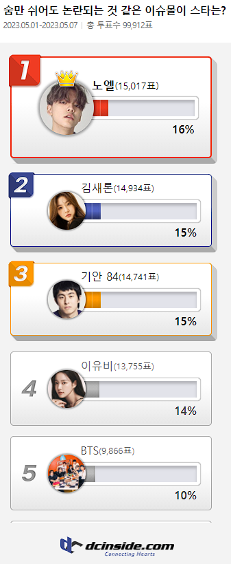 커뮤니티 포털사이트 디시인사이드(대표 김유식)가 `숨만 쉬어도 논란되는 것 같은 이슈몰이 스타는?`으로 투표를 한 결과 노엘이 1위에 올랐다. 이 투표는 지난 1일부터 7일까지 총 7일간 진행했다.