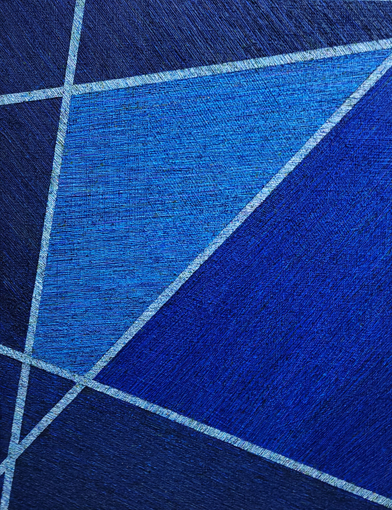 작가의 작업은 마치 섬유 조직을 연상케 하는 무수한 선들이 연속적으로 붙여지면서 면을 이루고, 그 면들이 기하학적인 구성을 통해 하나의 작업으로 완결 된다. 여기에서 볼 수 있는 질감을 가진 선들은 붓이 아니라 주사기의 산물이다.