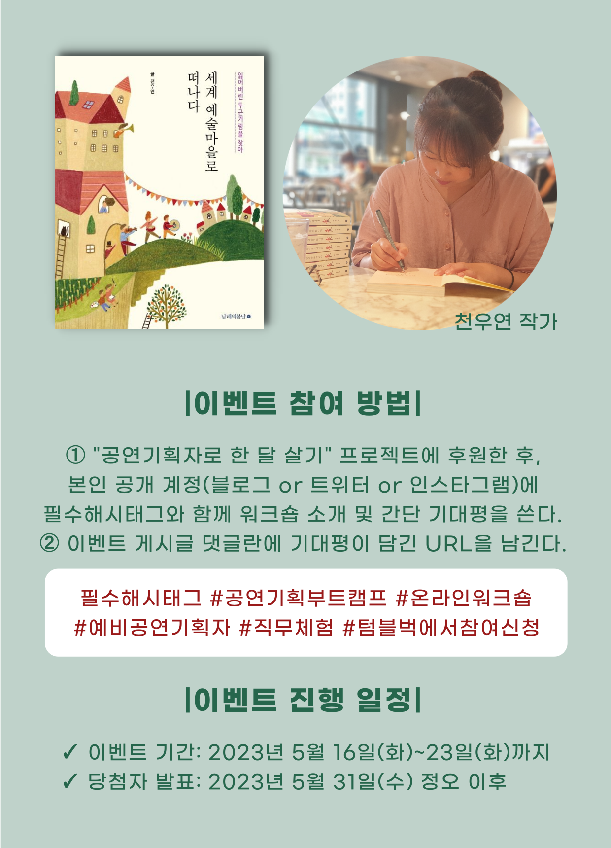 한편 '공연기획자로 한 달 살기! - 4주 인텐시브 온라인 워크숍' 프로젝트는 오는 23일까지 텀블벅에서 후원을 통해 참여 신청할 수 있다.