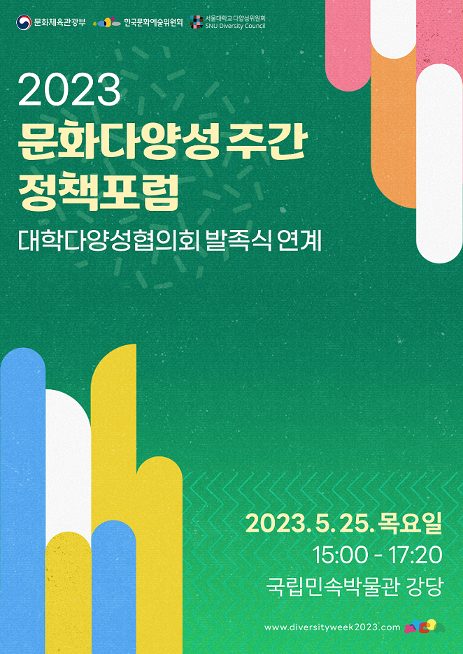 5월 25일(목) 오후 3시, 국립민속박물관 강당에서는 2023 문화다양성 주간 정책포럼이 개최된다. 대학다양성협의회 발족식과 연계하여 개최되는 이번 포럼은 민-관의 정책 협력과 문화다양성에 관한 사회적 논의를 확장하는 의미 있는 시간이 될 예정이다.