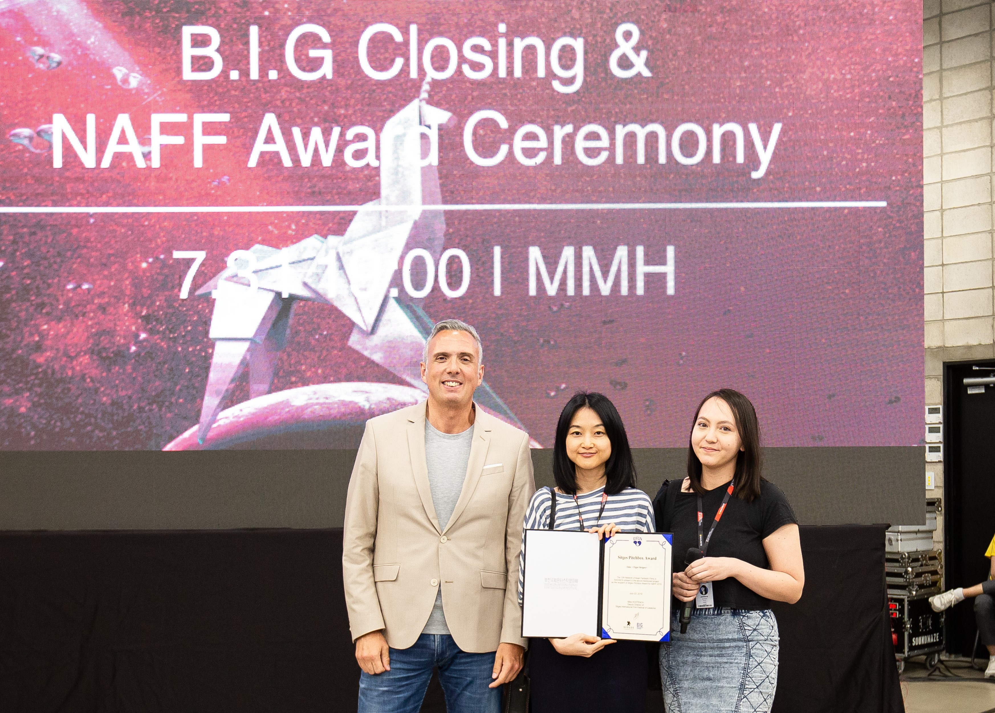 2019년 산업프로그램(B.I.G) NAFF ‘시체스 피치박스상’을 수상한 '호랑이 소녀'의 페이 링 푸 프로듀서(가운데)와 아만다 넬 유 감독(오른쪽). 마이크 호스텐치 전 시체스영화제 공동 집행위원장(왼쪽)이 시상을 맡았다.