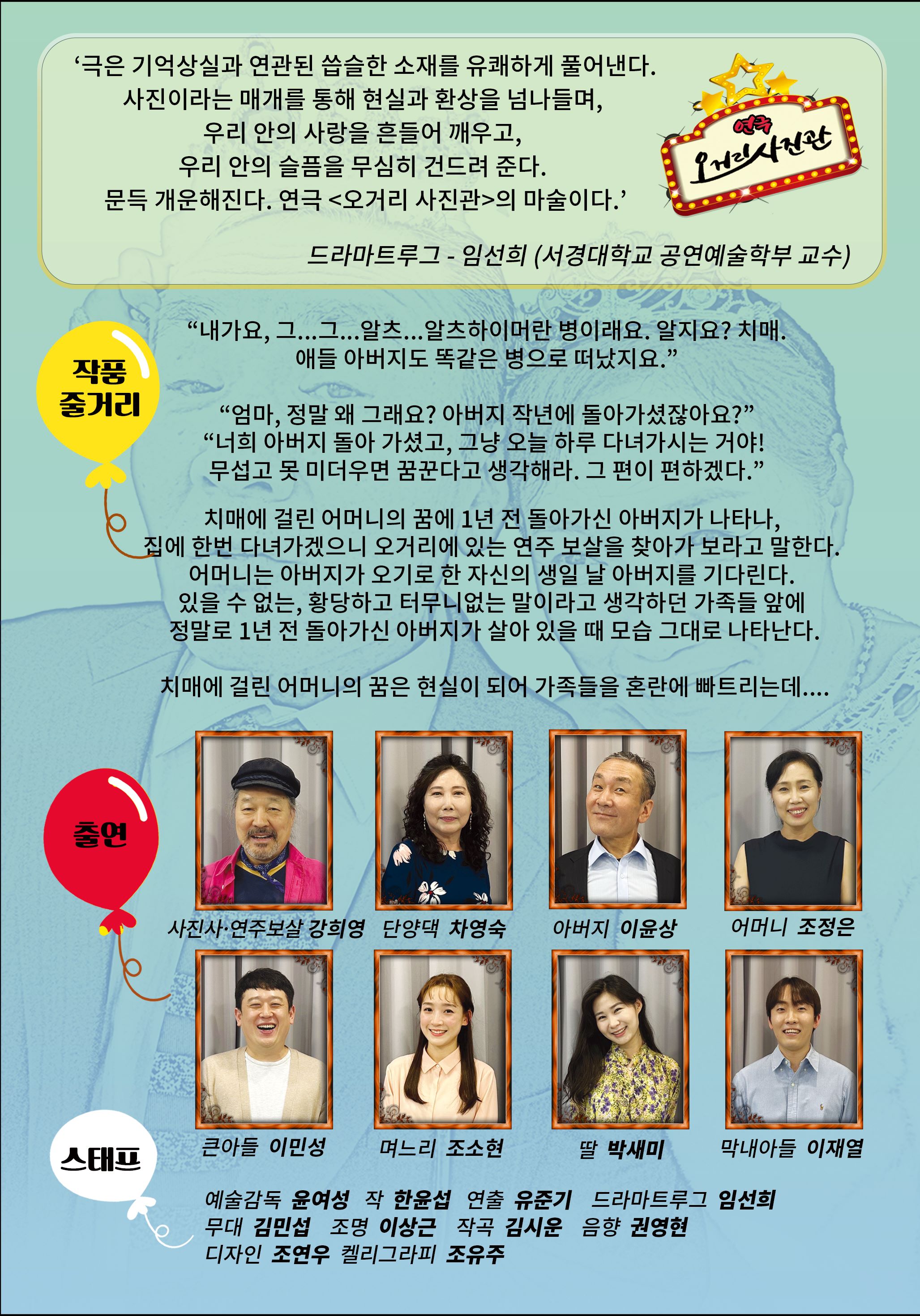 프로젝트그룹 같이 날자(대표 조미경) 제작, 한윤섭 작가의 오거리 사진관은 2012년 한국문화예술위원회 창작 활성화 지원작에 선정됐고, 제27회 거창 국제 연극제에서 희곡상을 수상, 작품성을 인정받은 치매를 소재로 한 연극이다.