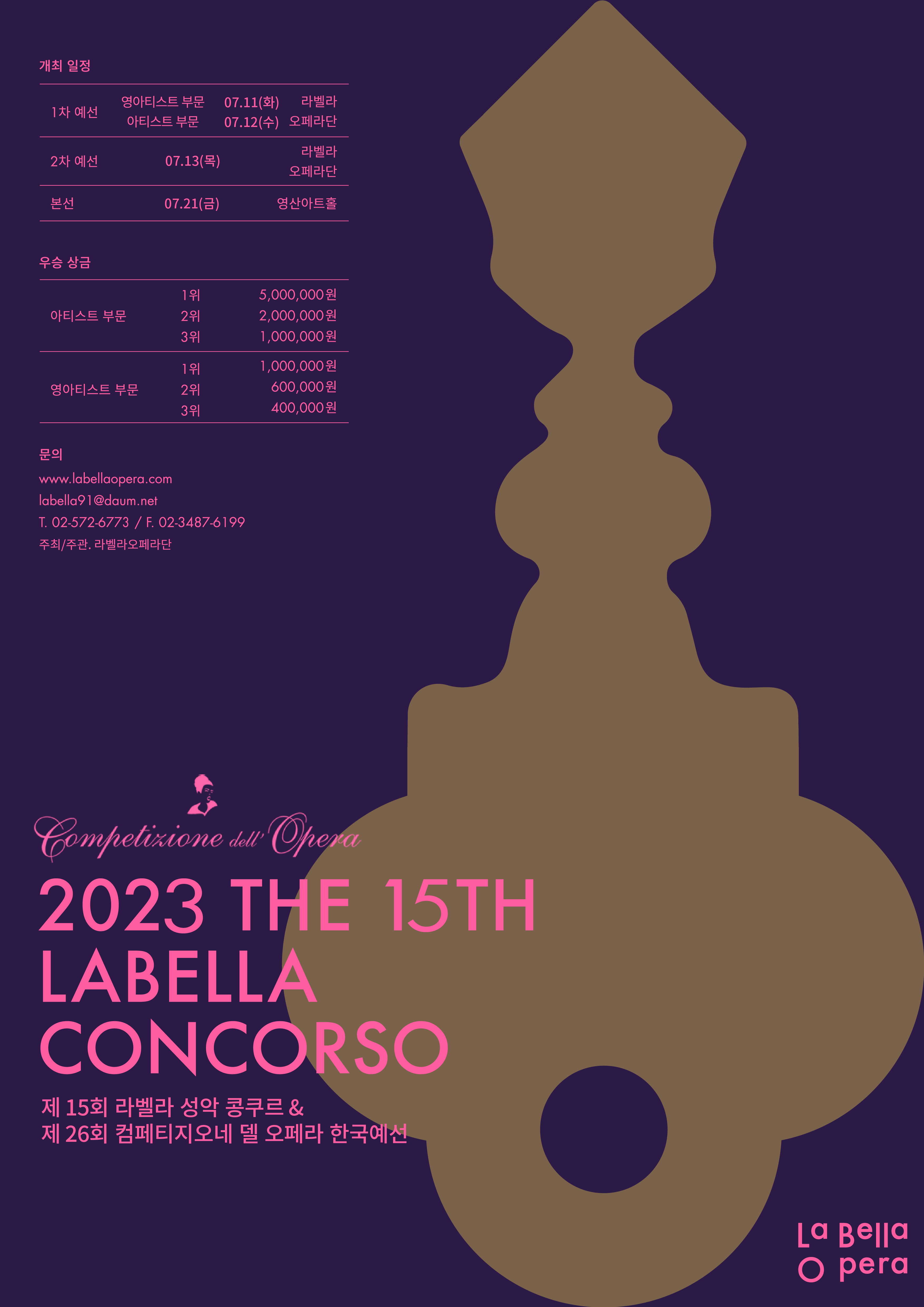 이번 라벨라 성악 콩쿠르는 아티스트 부문 1등 500만원을 비롯해 영아티스트 부문까지 전체 6명의 수상자에게 총 1000만원의 상금을 수여하며, 제15회 라벨라성악콩쿠르는 '2023 제26회 컴페티지오네 델 오페라' 한국예선을 겸하여 치뤄지며 입상자는 “컴페티지오네델오페라” 준결승 진출권이 주어진다.