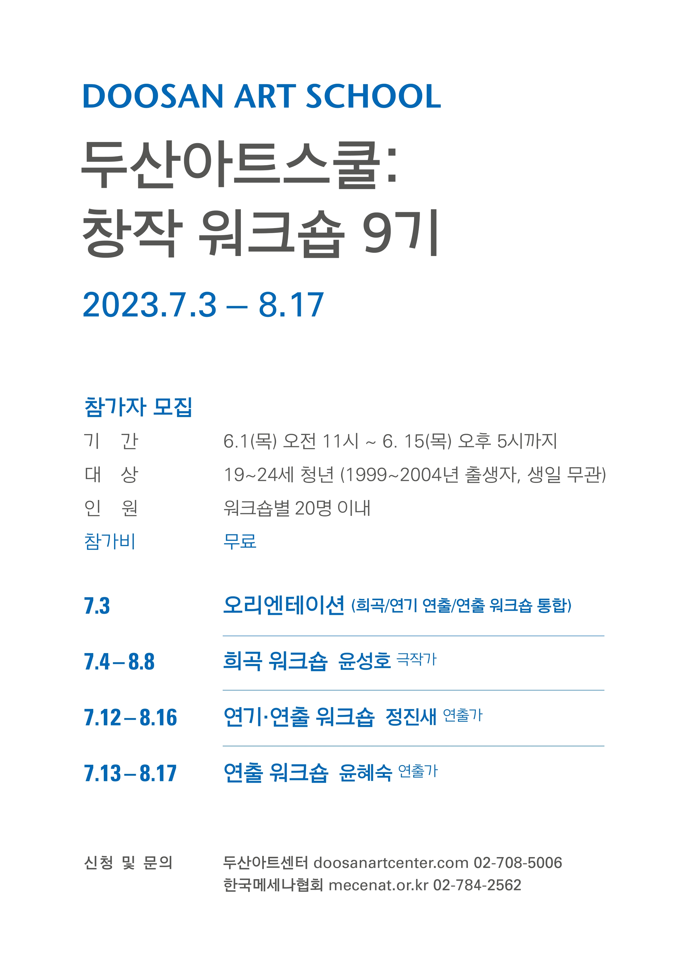 [플레이뉴스 문성식기자] (재)두산연강재단 두산아트센터(센터장 강석란)와 한국메세나협회(회장 김희근)가 주관하는 ‘두산아트스쿨: 창작 워크숍 9기’가 7월 3일부터 8월 17일까지 두산아트센터에서 진행한다.