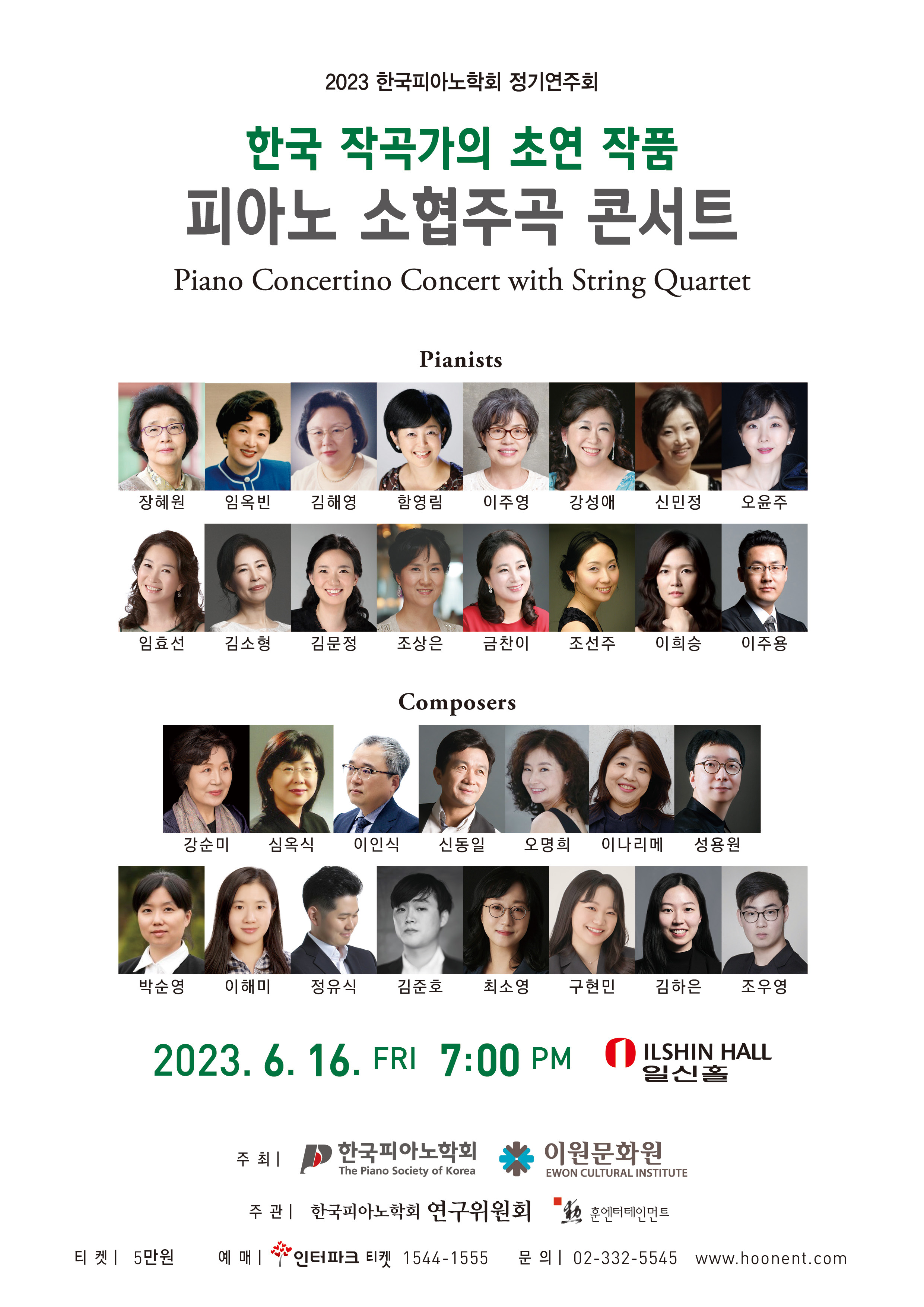 [플레이뉴스 문성식기자] 2023 한국피아노학회 정기연주회 ‘한국 작곡가의 초연작품 피아노 소협주곡 콘서트’가 오는 6월 16일(금요일) 오후 7시 일신홀에서 열린다.