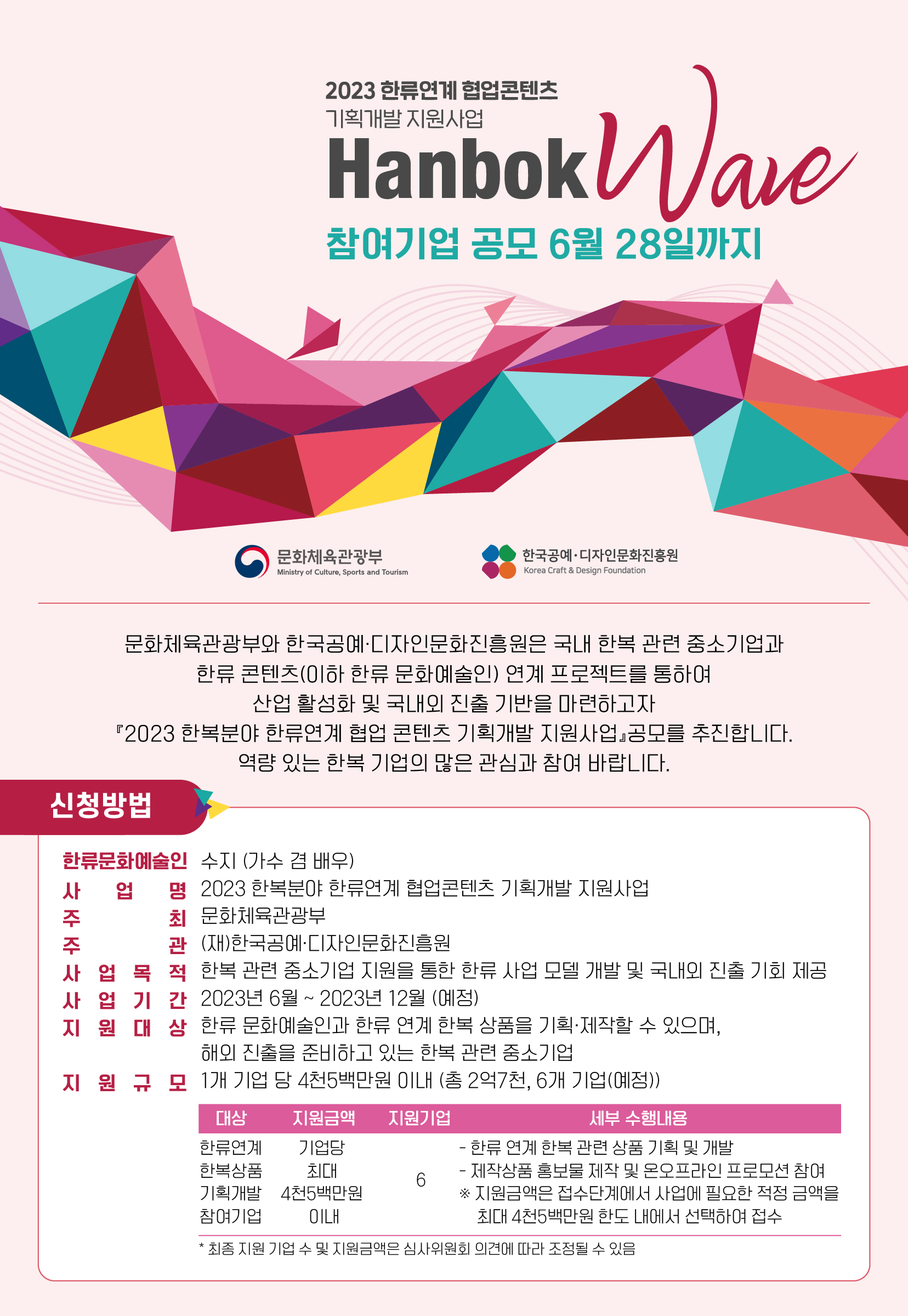 문화체육관광부(장관 박보균, 이하 문체부)가 한국공예‧디자인문화진흥원(이하 공진원)과 함께 추진하는 ‘한복분야 한류 연계 협업콘텐츠 기획‧개발’ 사업은 창의성이 있는 한복 디자이너들과 한류 문화예술인의 협업으로 한복의 매력을 국제사회에 알리고 한복업계의 해외 진출 지원을위한 것이다.