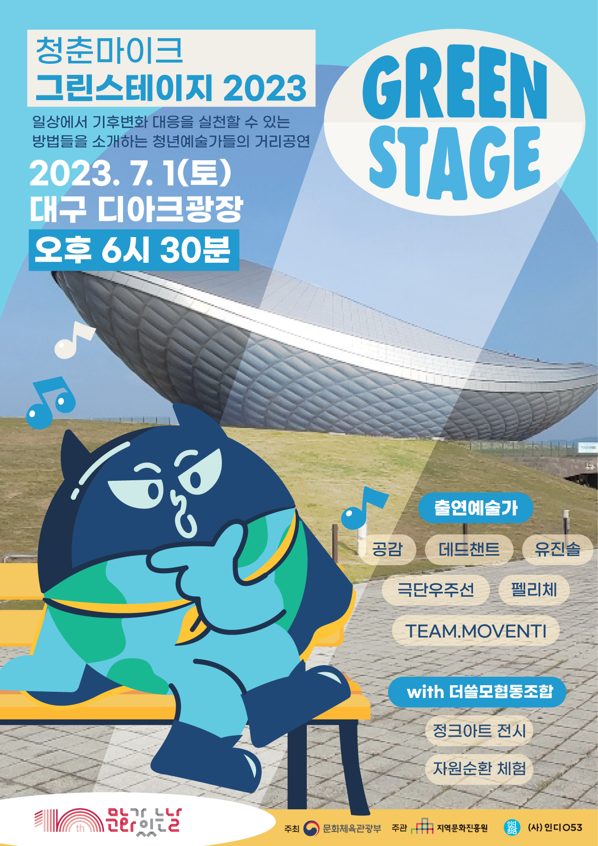 (사)인디053이 주관하는 ‘그린스테이지2023’은 만34세 이하 청년예술인들이 일상에서 기후위기에 대응하여 실천할 수 있는 3가지 주제(친환경소비, 환경정화, 생태보전)로 거리공연을 펼친다.