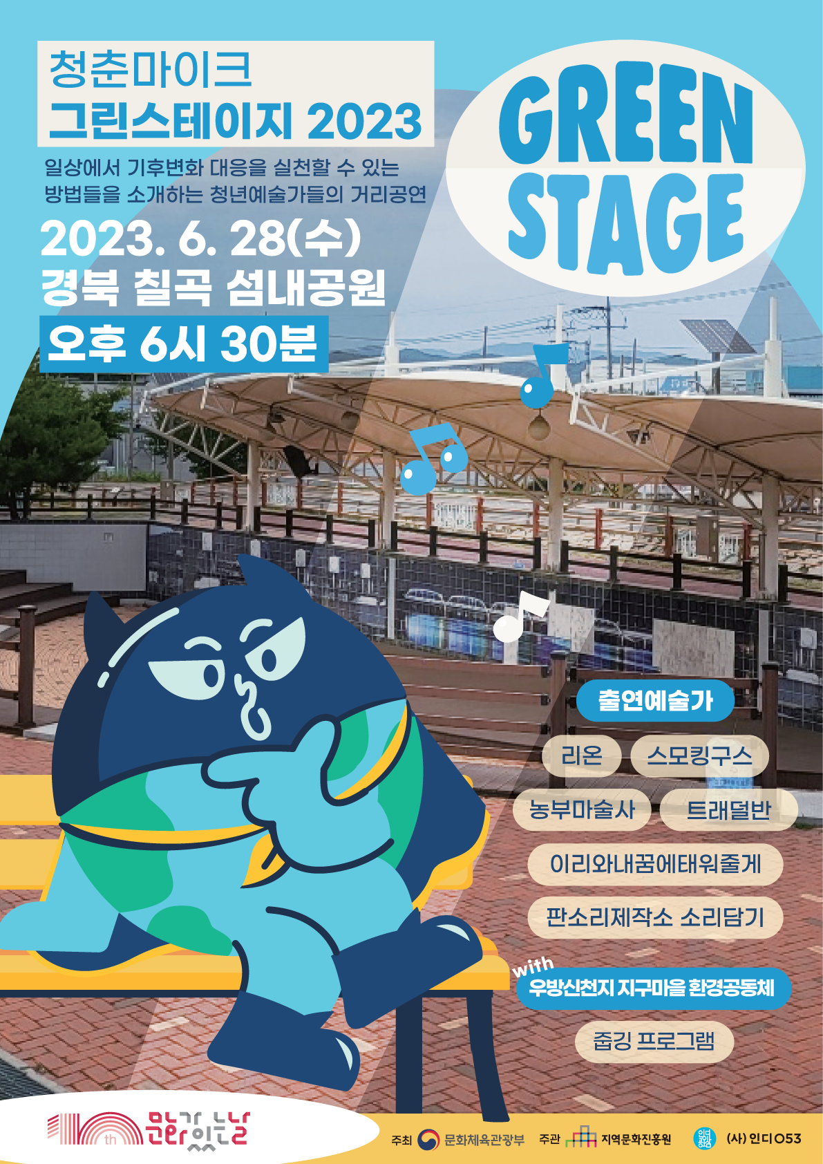 ‘그린스테이지2023’은 총 3회 열리는데 첫 번째로 경북 칠곡군 섬내공원(석적읍 중리)에서 6월 28일(수) 18시부터 열린다.