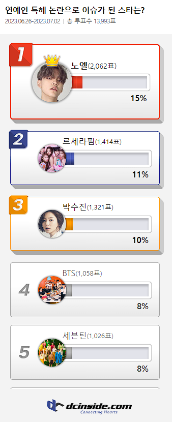 커뮤니티 포털사이트 디시인사이드(대표 김유식)가 `연예인 특혜 논란으로 이슈가 된 스타는?`으로 투표를 한 결과 노엘이 1위에 올랐다. 이 투표는 6월 26일부터 7월 2일까지 총 7일간 진행했다.
