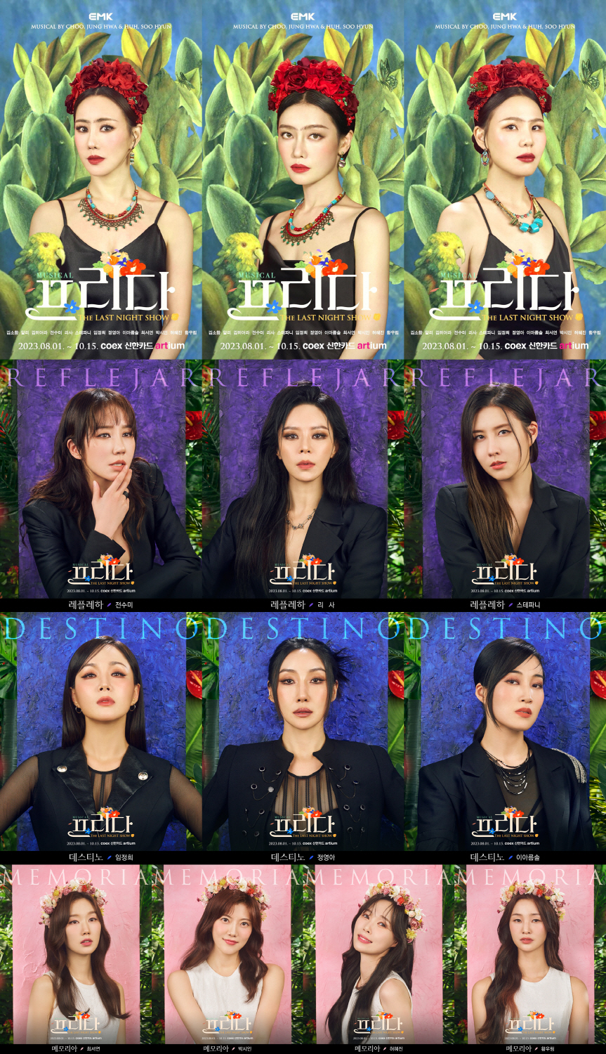 이어 공개된 포트레이트 포스터 또한 뮤지컬 '프리다'의 레플레하, 데스티노, 메모리아 역으로 무대에 오르는 전수미, 리사, 스테파니, 임정희, 정영아, 이아름솔, 최서연, 박시인, 허혜진, 황우림의 완벽한 캐릭터를 엿볼 수 있어 예비 관객들의 기대감을 증폭시켰다.