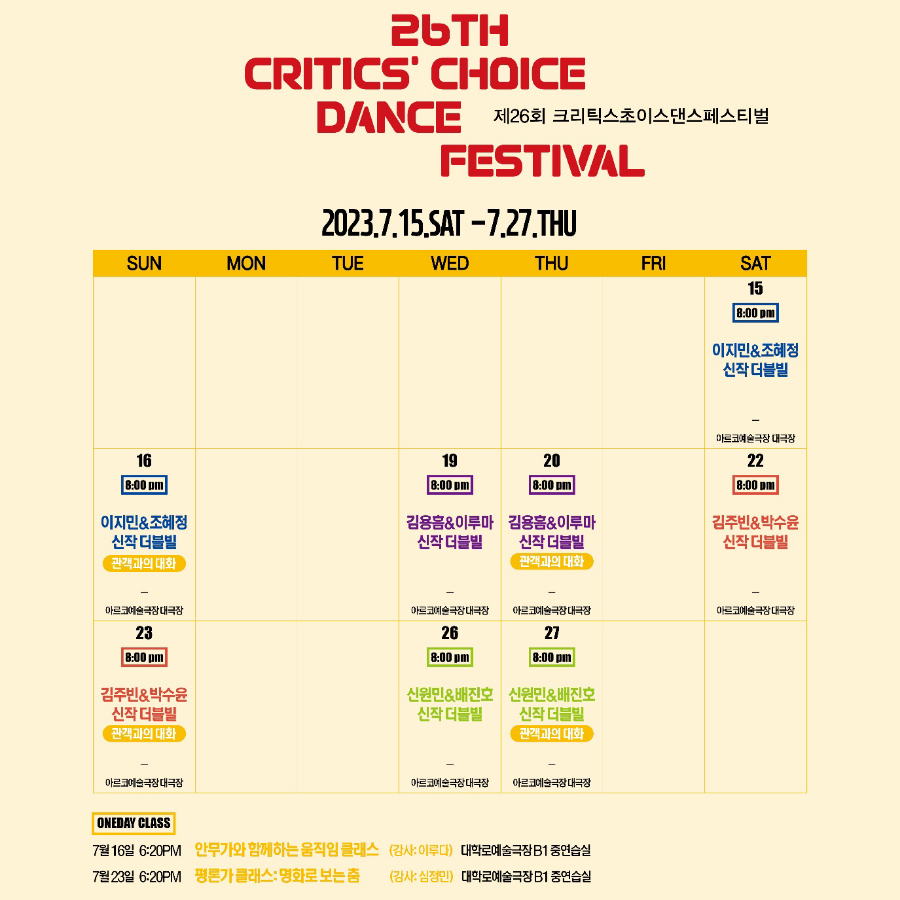 행사일시 : 2023. 7. 15.(토) ~ 27.(목) [공연]토·일·수·목 8:00pm, [클래스]일 6:20pm