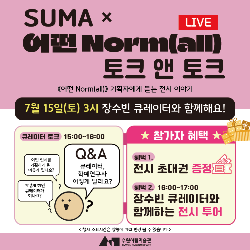 [플레이뉴스 문성식기자] 경기도 수원시 수원시립미술관(관장 홍건표)은《어떤 norm(all)》전시와 연계한 두 번째 강연 프로그램 '《어떤 Norm(all)》× 토크 앤 토크 '를 7월 15일(토) 오후 3시 수원시립미술관에서 개최한다.