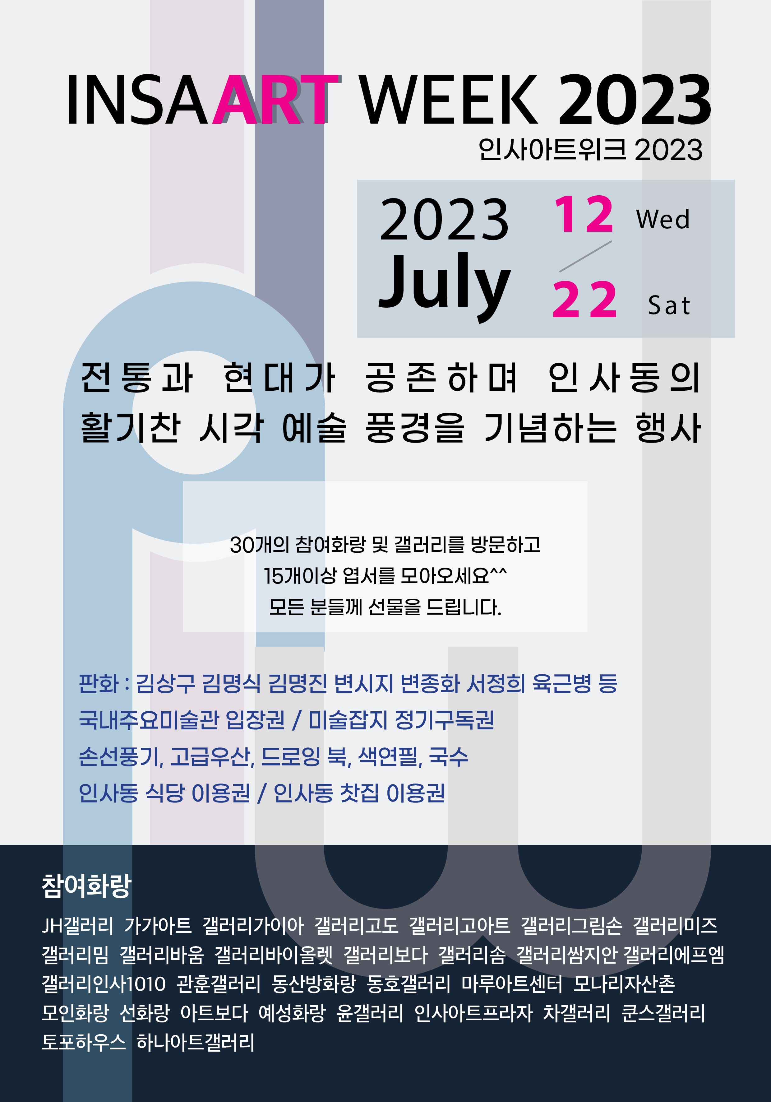 [플레이뉴스 문성식기자] 인사동의 문화예술을 활성화시키고 인사동의 시각 예술 풍경을 기념하기 위한 인사 아트위크가 7월 12일(수)부터 22일(토)까지 개최된다. 인사동은 한국의 제 1호 문화지구로서 한국의 예술을 옹호하고 문화적 전통을 보존하며, 그 취지를 반영하여 인사 아트위크는 인사동만의 특색 있는 예술 풍경이 각 갤러리마다 담길 예정이다.