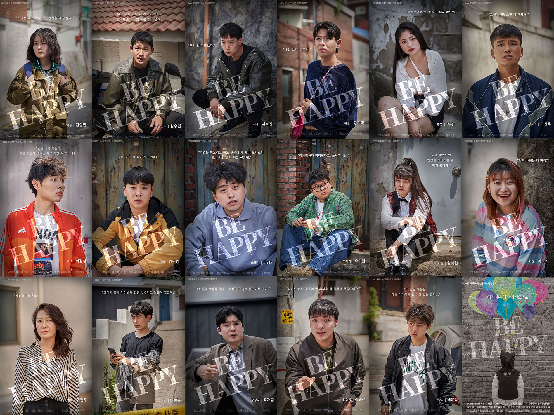 [플레이뉴스 문성식기자] 제4회 여주인공 페스티벌 참가작인 극단 창창의 연극 'BE HAPPY'가 8월 2일부터 6일까지 대학로 미마지아트센터 물빛극장에서 공연된다. 개막을 3주 앞두고 연극 속 캐릭터 별 개성이 드러난 컨셉 사진 및 대사와 함께 17종의 캐릭터 포스터를 공개했다.