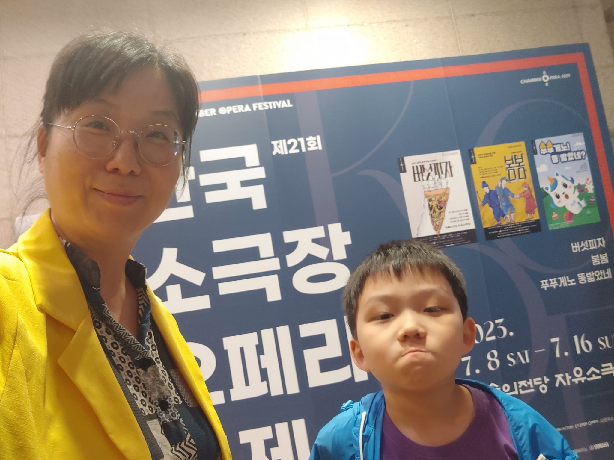 ▲&nbsp;작곡가 기자 엄마랑 푸푸게노 똥 밟았네 관람 후 인증샷을 찍고있는 막내군.&nbsp;ⓒ 박순영