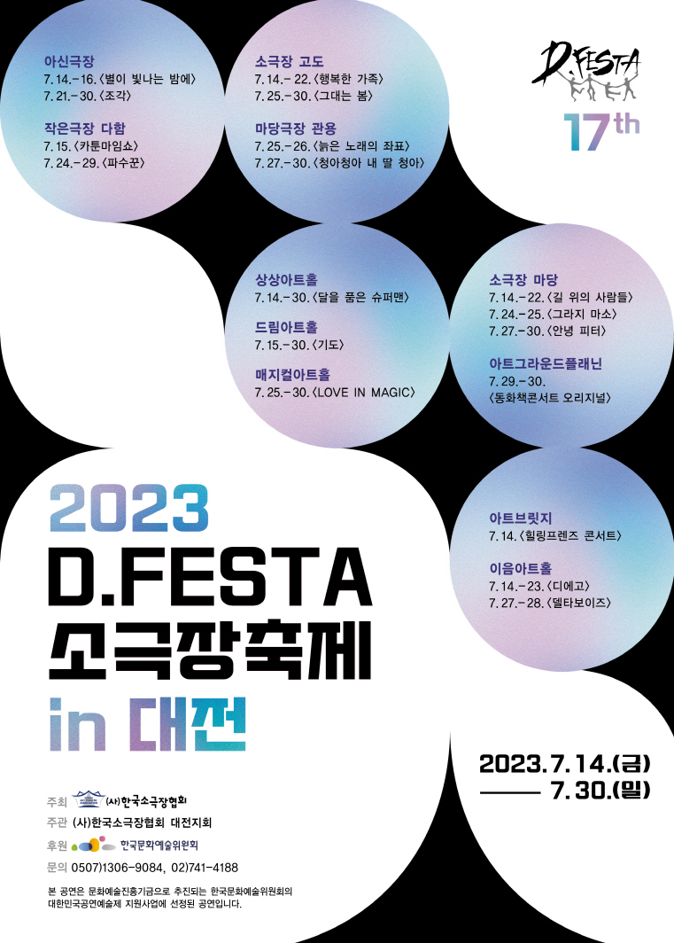 대전에서 열리는 2023 D.FESTA 소극장축제는 714일 상상아트홀에서 개막식을 시작으로 공식 초청작, 경남극단 현장의 카툰마임쇼’,부산 부두연극단의 그라지 마소’, 서울 더튠의 늙은 노래의 좌표‘, 서울 조정박최장김박변김송현서 프로젝트의 델타보이즈‘, 제작참가작으로 대전 극단 떼아뜨르 고도의 행복한 가족‘, 대전 극단 셰익스피어의 달을 품은 슈퍼맨’, 대전 다함쿱 사회적협동조합의 파수꾼’, 대전 이모션콘텐츠의 ‘LOVE IN MAGIC’이 공연된다.