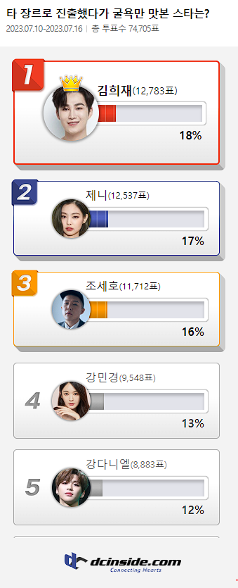 커뮤니티 포털사이트 디시인사이드(대표 김유식)가 `타 장르로 진출했다가 굴욕만 맛본 스타는?`으로 투표를 한 결과 김희재가 1위에 올랐다. 이 투표는 지난 10일부터 16일까지 총 7일간 진행했다.