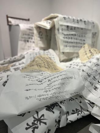| 엄마가 들려주는 창작동화, 화선지에 먹, 140*210cm, 2023 | 수적천석, 한지에 먹, 가변설치, 2023 |