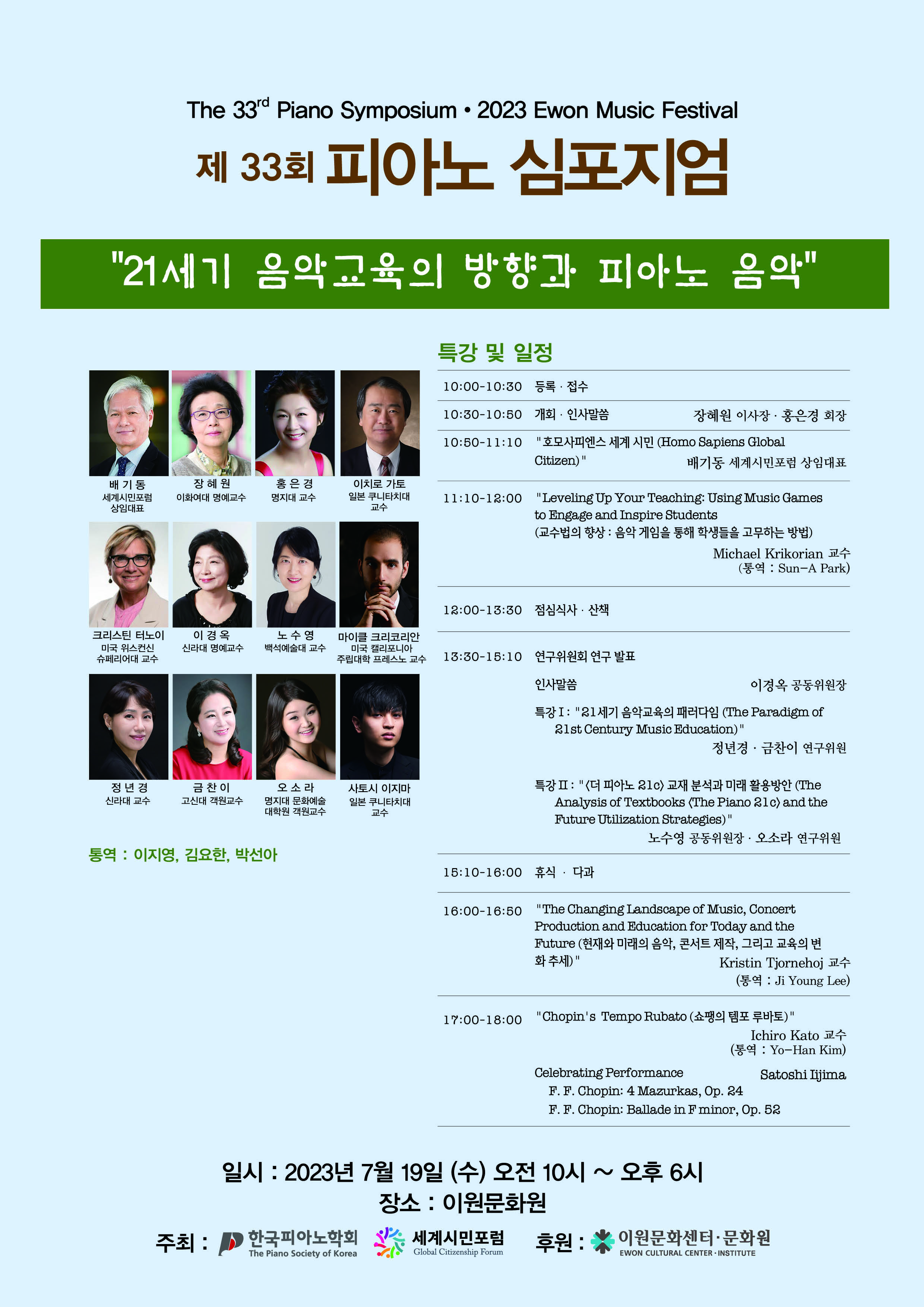 이어 배기동 상임대표가 "호모 사피엔스 세계시민"을 주제로 연설을 했으며, 11시에는 마이클 크리코리안 (미국 캘리포니아 주립대학 프레스노) 교수가 "교수법의 향상: 음악게임을 통해 학생들을 고무하는 방법"를 주제로 강연을 펼쳤다. 오후에는 한국피아노학회 노수영 공동위원장이 피아노학회 편찬의 <더 피아노 21c>교재의 미래 활용방안을 논하고, 크리코린 티노이(미국 위스컨신 슈페리어대) 교수가 쇼팽의 템포 루바토를 분석하는 등 강연이 펼쳐진다.