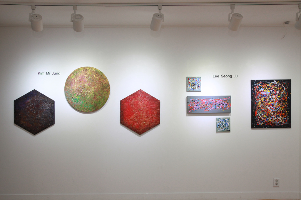 이성주 작가의 '무아지경'은 남사당놀이의 춤, 흥, 장단을 무의식적으로 몸이 가는 대로 캔버스 위에 페인트를 붓거나 떨어뜨리며 기쁨과 환희를 만들어 냈다. 무아지경에 이르게 하는 우리민족의 음악적 표현이자 흥을 현대미술로 재해석하여 한국인의 총체적 에너지를 표현했다.