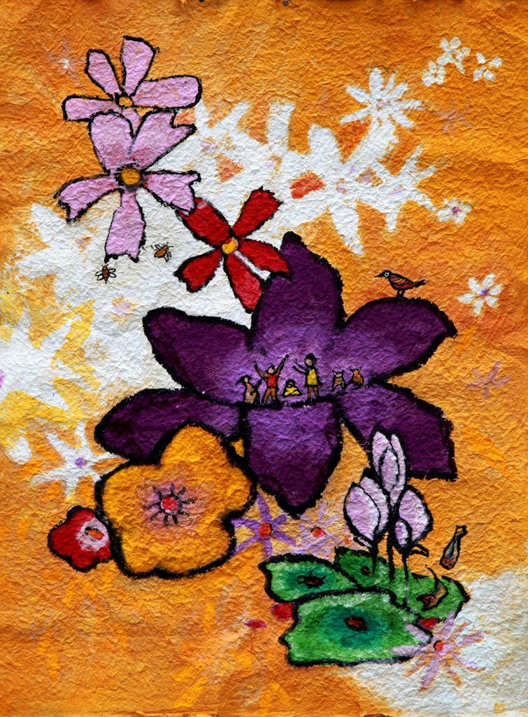 “꽃밭에서” 작품은 시각적으로 보이는 꽃 자체의 아름다움 보다 순수성을 간직한 원초적 내면의 아름다움을 발현시키려 했다. 꽃잎의 단순화와 선명한 색감으로 주제를 즉각적으로 받아들일 수 있도록 했으며, 불필요한 덧붙임이 없이 꽃의 원형 그대로 크고 중심에 그려 세련미까지 묻어난다.
