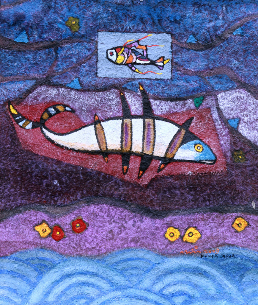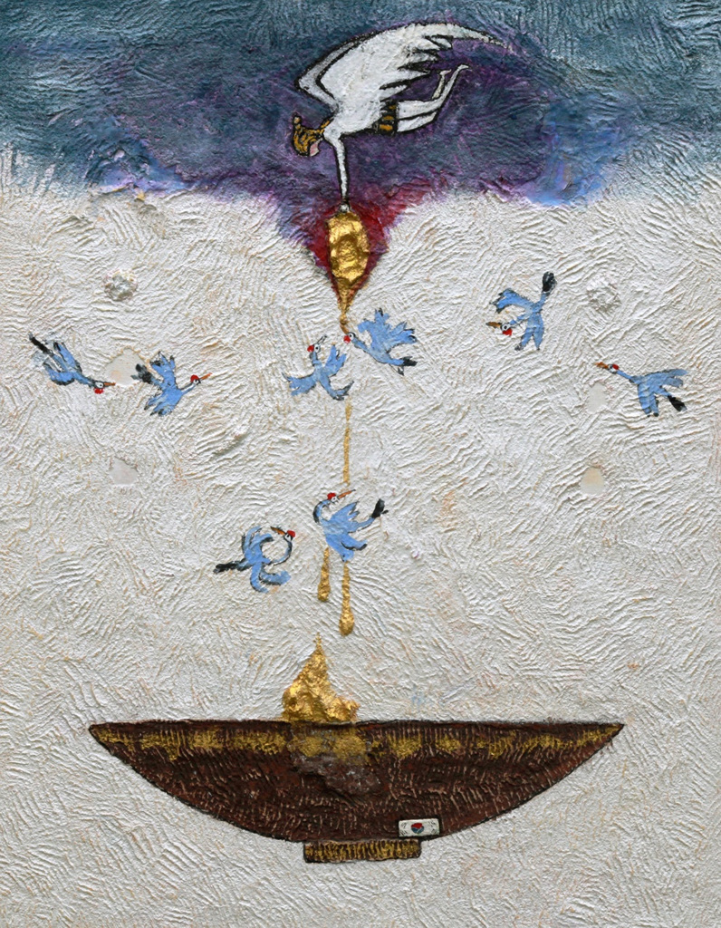 코리아라는 고귀한 그릇에 하늘의 천사가 황금을 내려주고 새들은 춤추는 그림을 구상했다, 가난하고 어려웠던 시절을 잘 극복하고 이제는 미래 한국에 희망을 바라는 인생 종착점에 선 작가가 후세대에게 남기고 싶은 마음으로 작품을 완성했다.