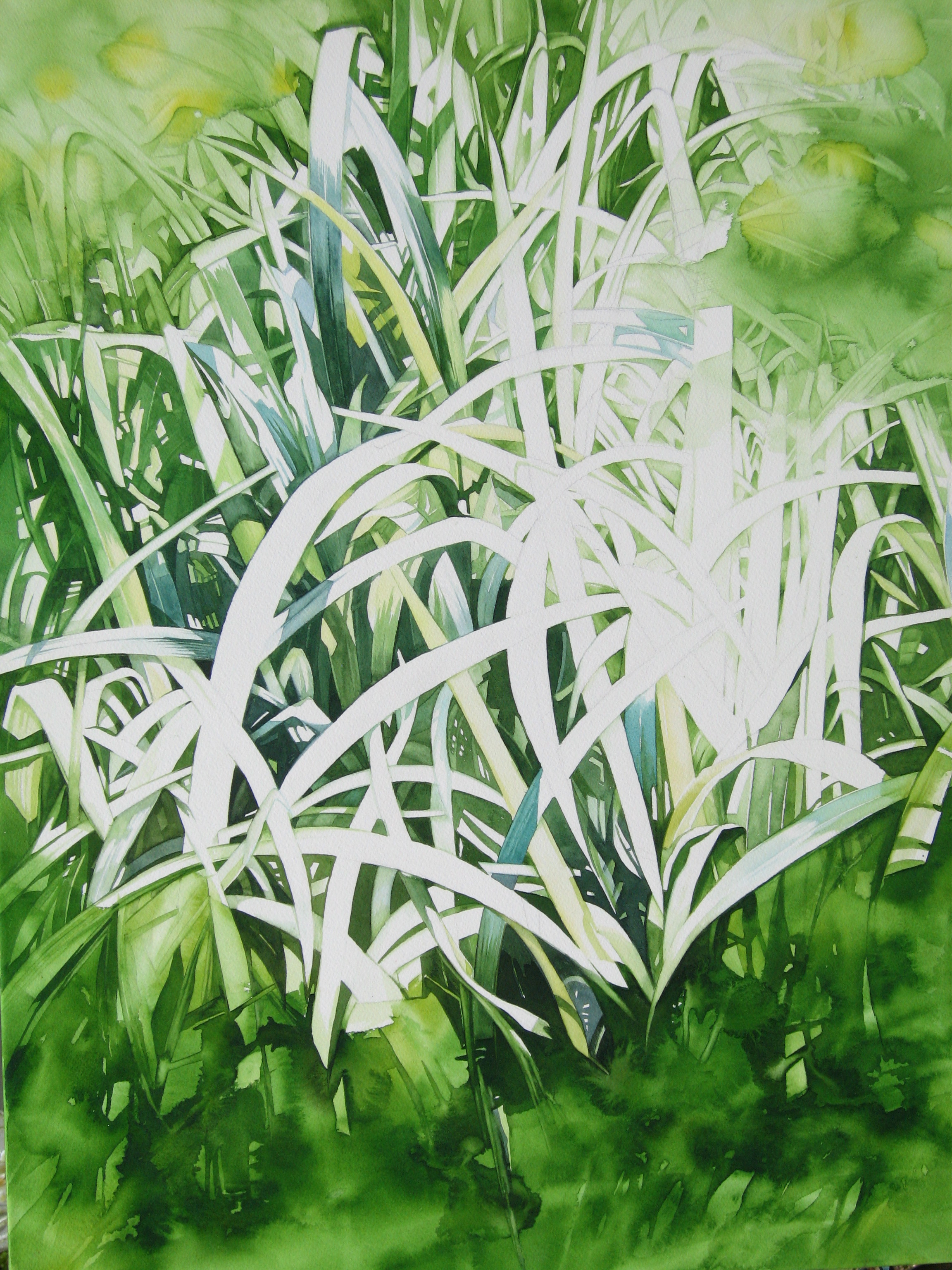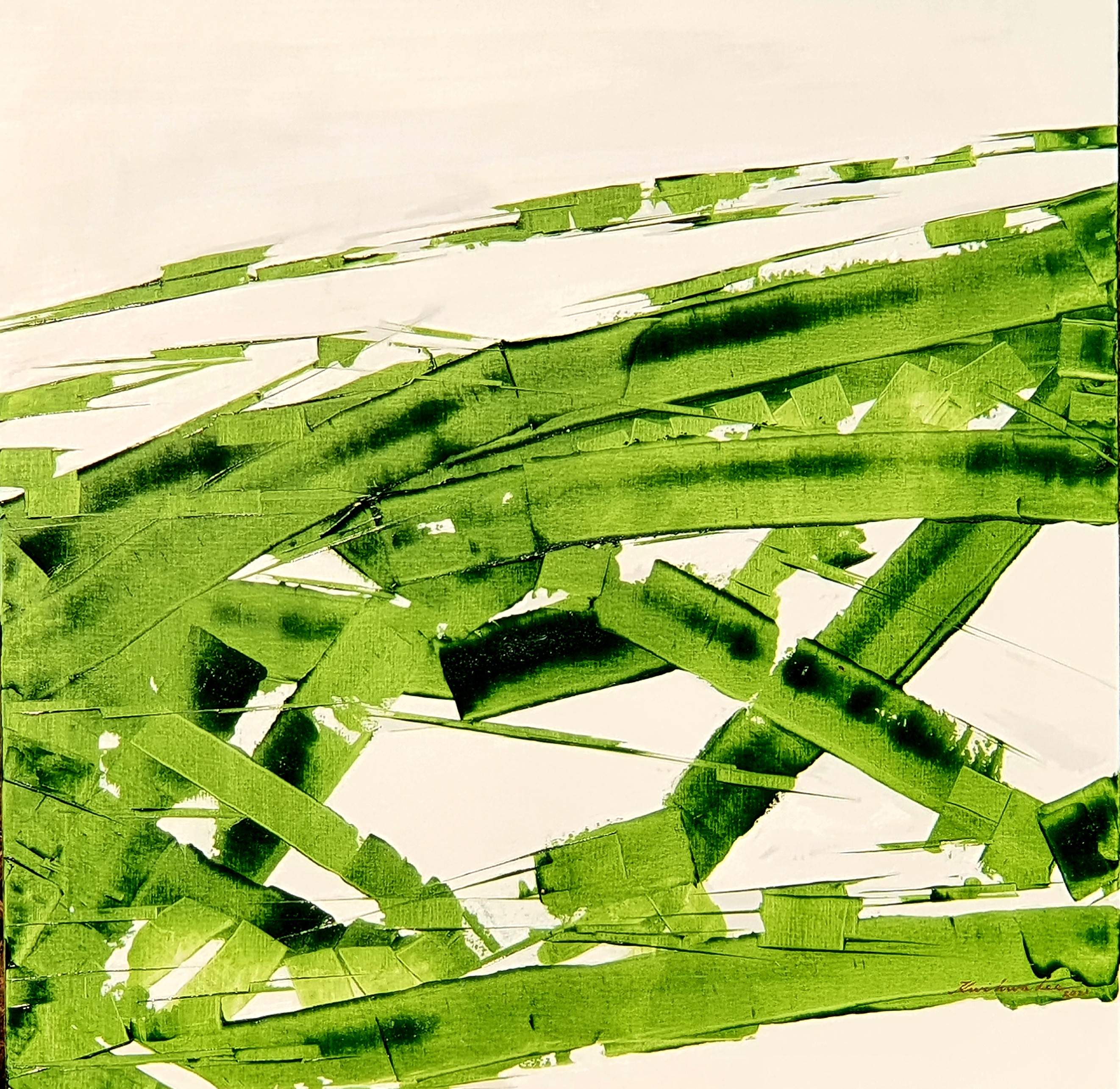 그림의 주제인 넝쿨 속 들판의 잡초는 서로 엉킴 없이 제 위치를 자리해 가치를 다하고 있다. 풀들이 서 있는 모습이 아닌 무질서하게 널브러져있는 모습은 여러 감각들이 어우러진 공감각적인 추상화가 된다. 녹색평면덩어리가 끝없이 이어지는 선분의 연속은 무한한 자연의 숭고함과도 같다.