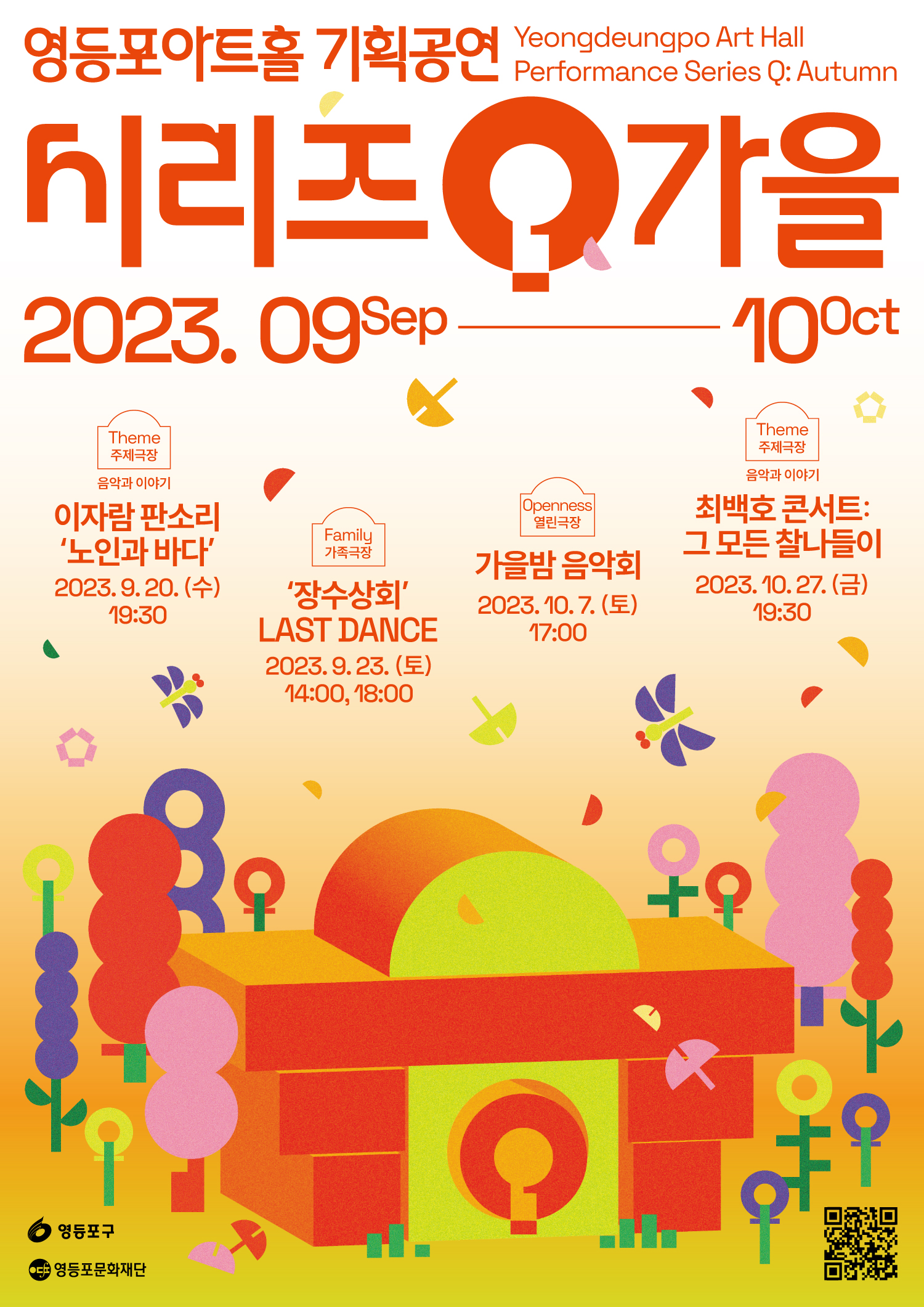 ‘시리즈Q’는 전문 공연장으로 새롭게 발돋움하는 영등포아트홀의 기획공연 브랜드로 주제극장, 가족극장, 열린극장 3가지 레퍼토리로 구성돼 있으며, 이번 시즌에는 이자람 판소리 ‘노인과 바다’(9.20.), ‘장수상회: LAST DANCE’(9.23.), ‘최백호 콘서트: 그 모든 찰나들이’(10.27.)와 같이 다양한 장르의 공연을 관객에게 선보인다.