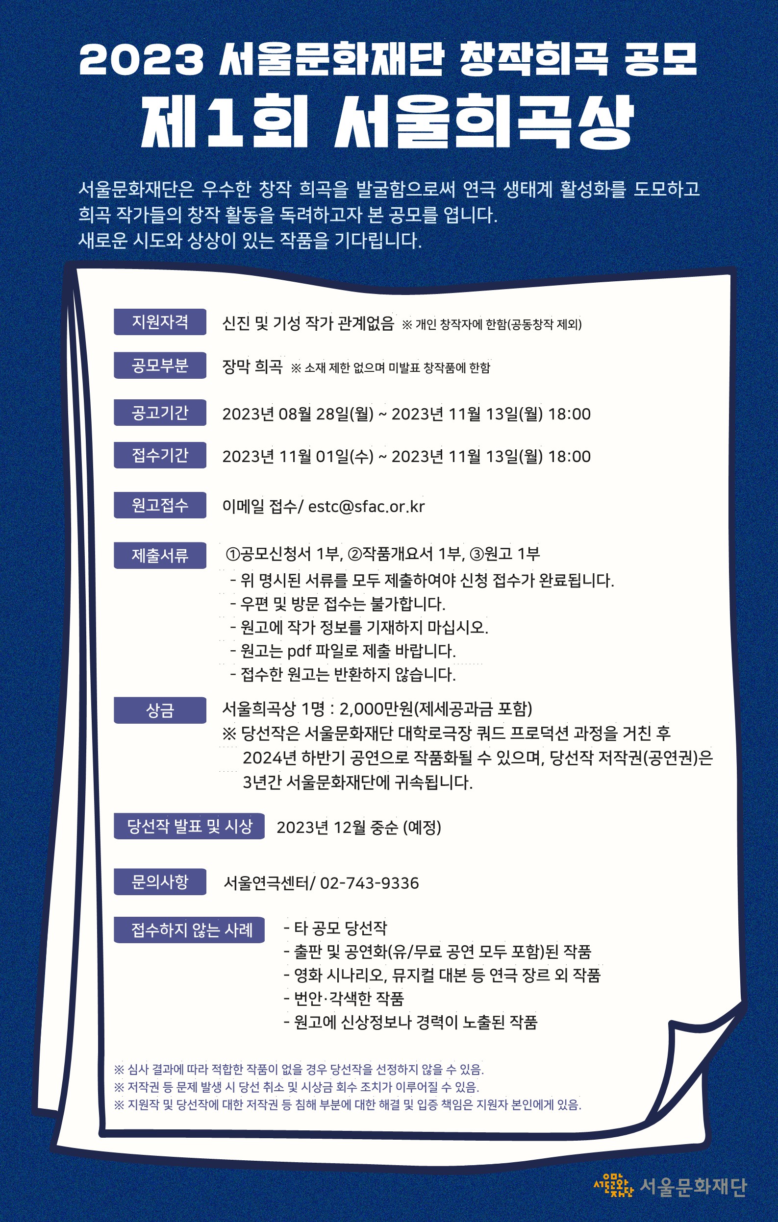 ▶ 서울문화재단, '제1회 서울희곡상' 오는 28일(월) 공고, 11월 13일(월) 마감