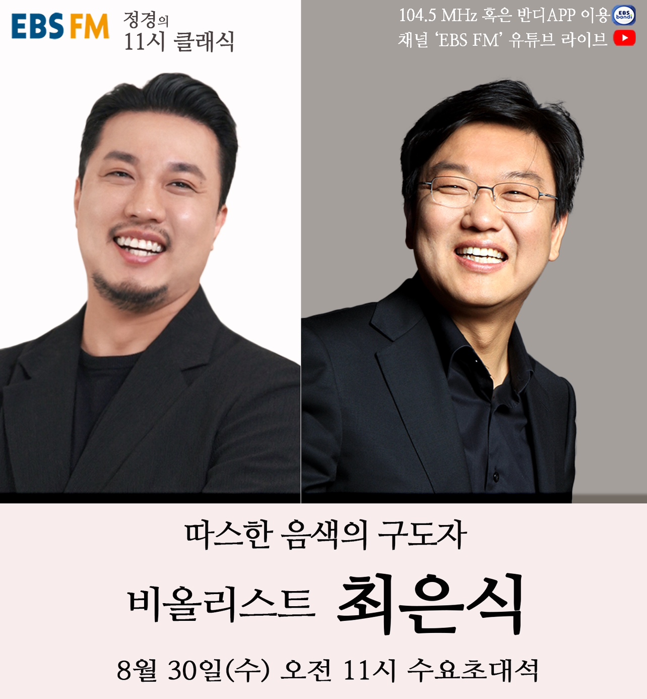 수요일에 마련되는 '수요초대석'에서는 클래식 음악계의 명사들을 초대, 음악과 인생 이야기와 함께 진솔하고 특별한 토크를 이어가고 있다. 8월 30일에는 서울대학과 음악대학 학장 비올리스트 최은식이 출연한다.