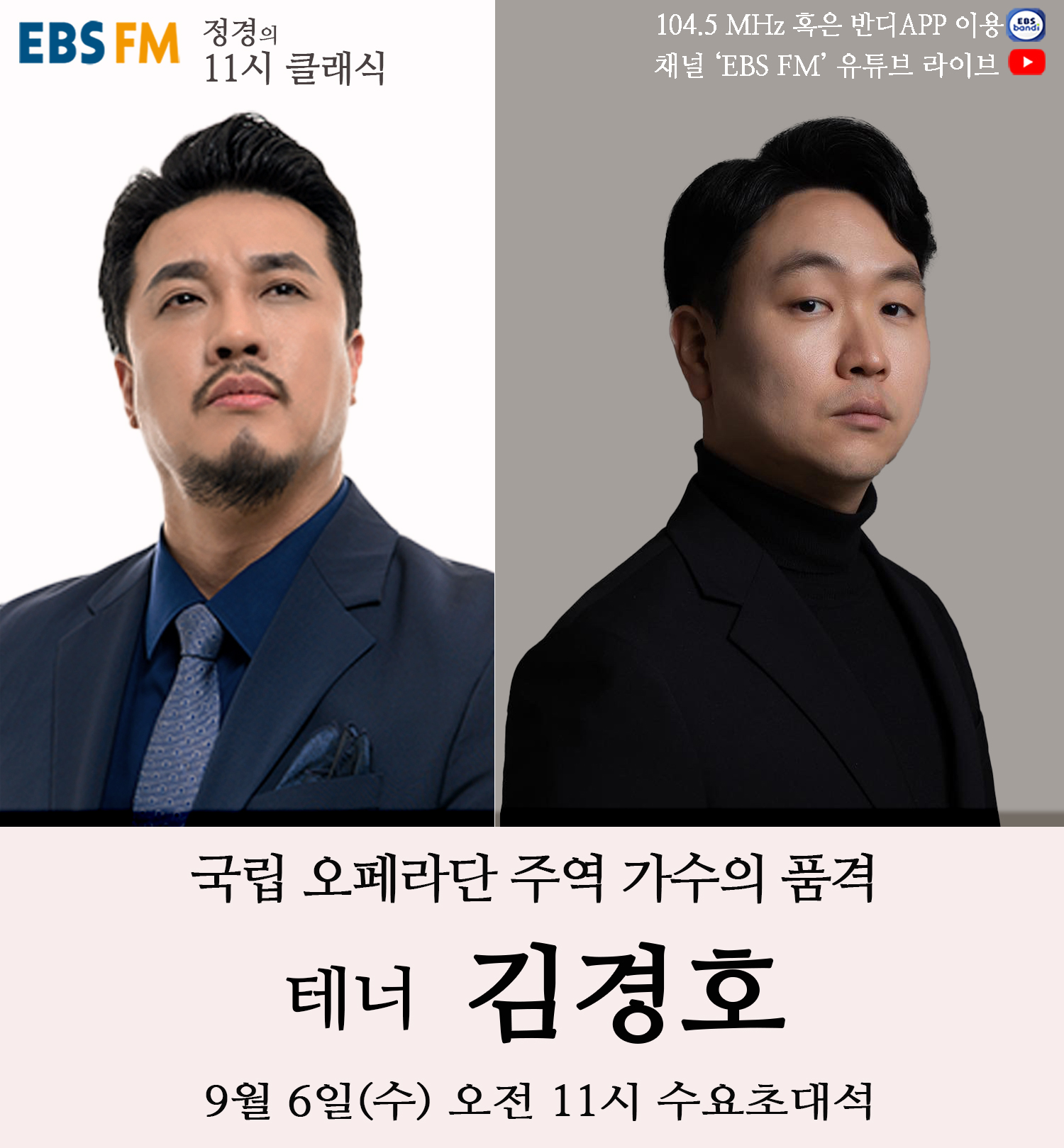 수요일에 방송되고 있는 '수요초대석'에서는 클래식 음악계의 명사들을 초대, 음악과 인생 이야기와 함께 진솔하고 특별한 토크를 이어가고 있다. 9월 6일에는 오페라 무대에서 더욱 빛나는 테너 김경호가 출연한다.