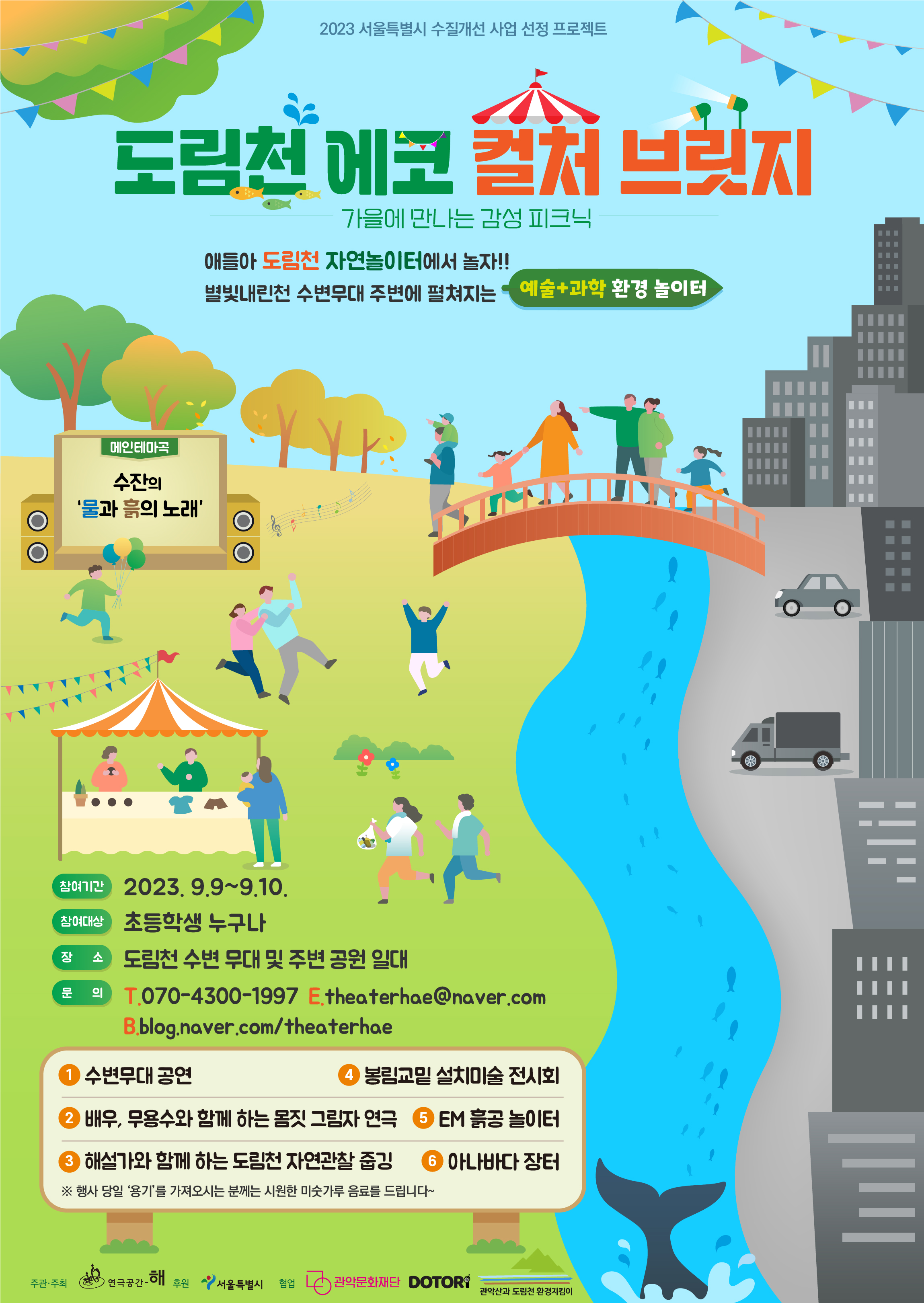 극단 해는 서울시 수질 개선사업의 일환으로 9월 9일~10일 양일간 관악구 도림천에서 열린 ‘도림천 에코 컬처 브릿지’ 축제에서 물과 문화예술, 그리고 과학기술의 융합을 통해 세상과 사람을 연결하는 축제의 장을 열었다.