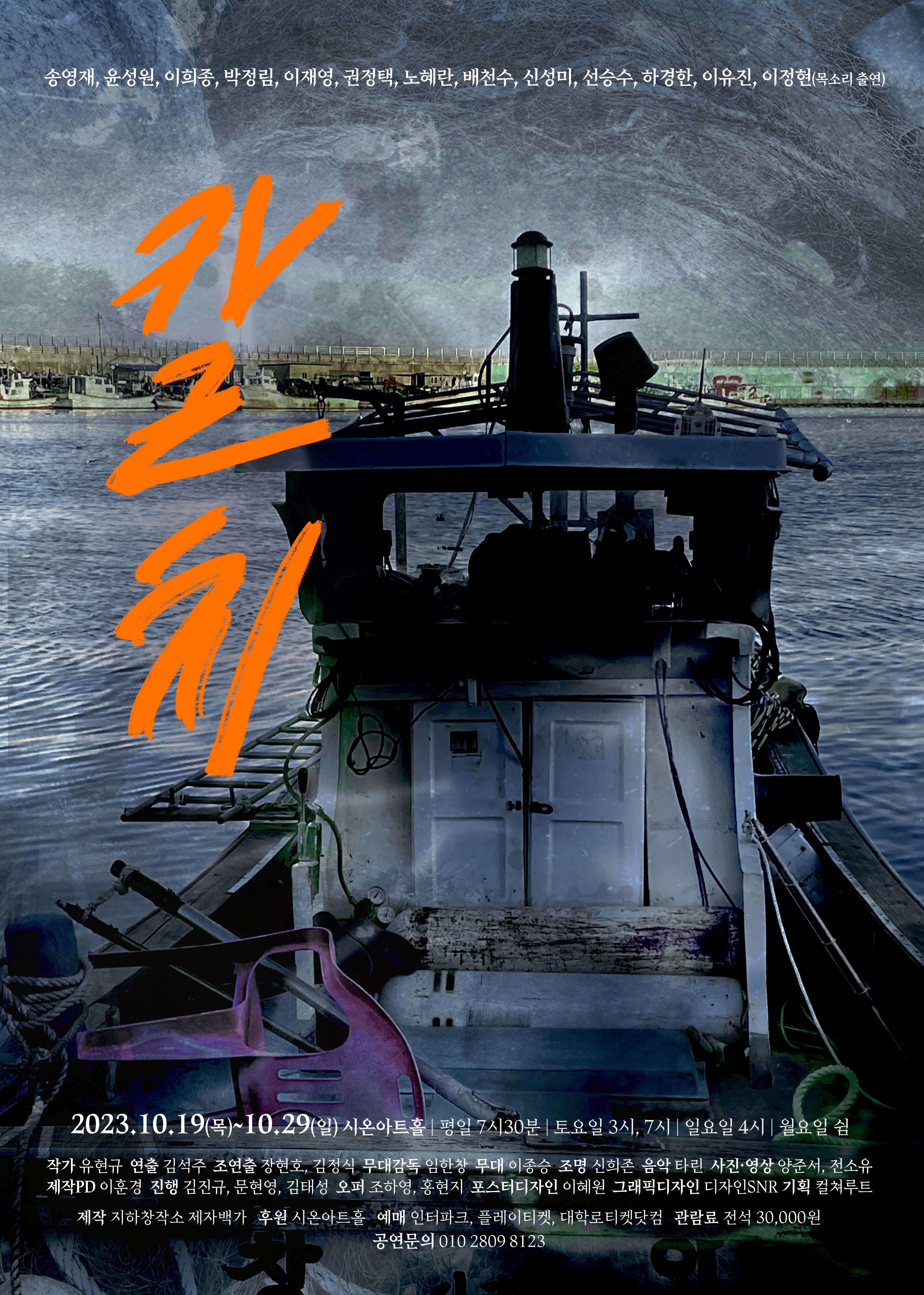 지하창작소 제자백가의 <칼치>는 오는 1019일부터 1029일까지 대학로 시온아트홀에서 공연한다. 작 유현규, 연출 김석주, 출연 송영재, 윤성원, 이희종, 박정림, 이재영, 권정택, 노혜란, 배천수, 신성미, 선승수, 하경한, 이유진. 목소리 출연 이정현. 평일 19:30 | 토요일 15:00, 19:00 | 일요일 16:00 (월요일 공연없음). 공연문의 지하창작소 제자백가 <칼치> 기획팀 010-2809-8123