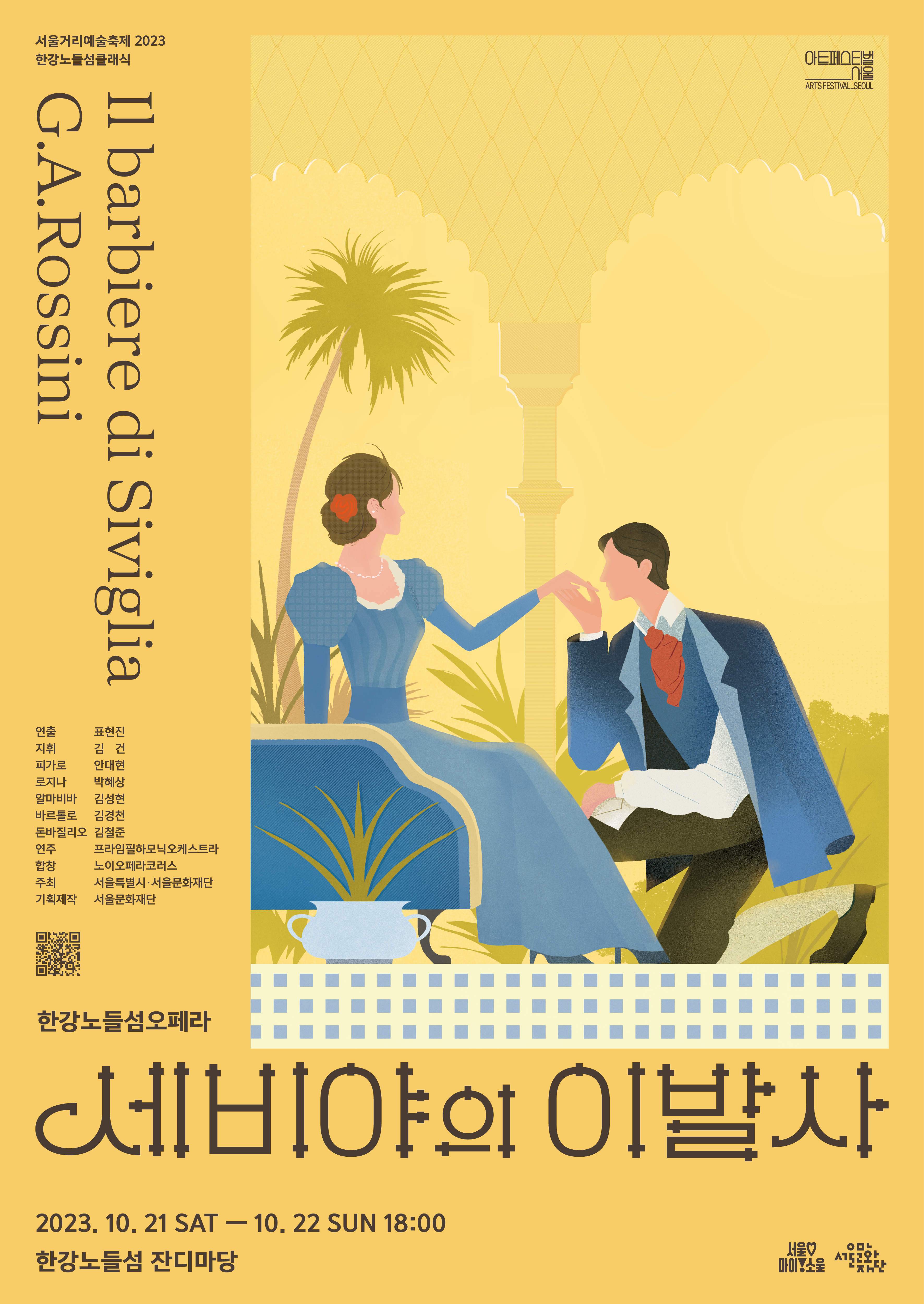 ○ 공 연 명: 한강노들섬클래식 ‘한강노들섬오페라’ ○ 일 시 :2023.10.21.(토)-22(일) 18:00 ○ 장 소: 노들섬 ○ 공연작품: 세비야의 이발사 ○ 제작 및 출연진 - 연출 표현진 지휘 김 건 피가로(Bar.) 안대현 로지나(Sop.) 박혜상 알마비바(Ten.) 김성현 바르톨로(Bar.) 김경천 바질리오(Bass.) 김철준 연주 군포프라임필하모닉오케스트라 합창 노이오페라코러스 ○ 티켓오픈 : 9.13(수) 인터파크 티켓 ○ 티켓가격 : 전석 무료(사전예약 필수) ○ 주 최: 서울특별시, 서울문화재단 ○ 인스타그램: @hangangarts.sfac ○ 문 의 : 02-758-2046, 2043 |