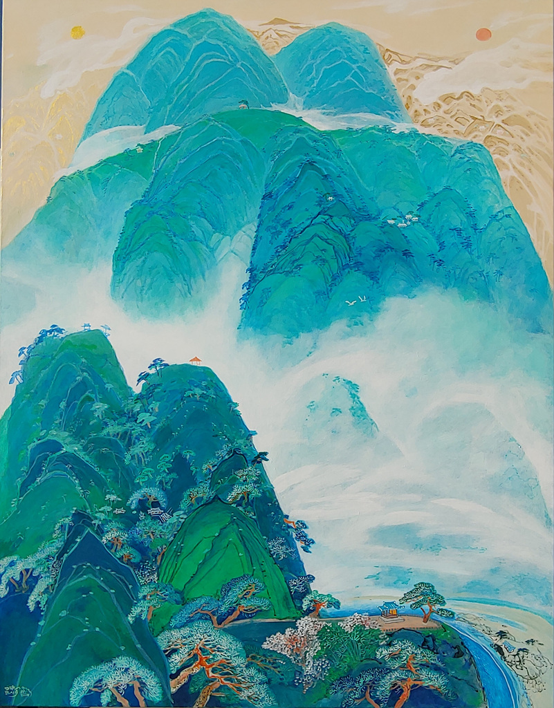 [플레이뉴스 문성식기자] 먹과 아크릴 재료로 채색된 전통 산수화 이미지를 캔버스에 그려 한지 위의 수묵화 보다 선명성을 부각시켰다. 먹과 아크릴은 동서양의 조화로운 만남처럼 산뜻한 청록산수화로 제작되어 현대인들에게 공감을 얻기 충분하다.