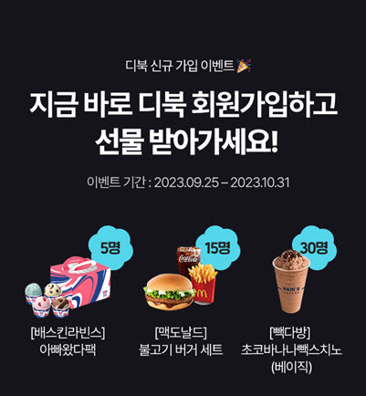 이번 이벤트는 오는 31일까지 디북 앱을 다운로드한 후 회원가입을 완료하면 자동 응모된다. 당첨자는 11월 6일 디북 앱 내 공지사항에서 확인 가능하며, 추첨을 통해 배스킨라빈스 아빠왔다팩(5명), 맥도날드 불고기 버거 세트(15명), 빽다방 초코바나나빽스치노(30명) 등의 상품을 증정한다.